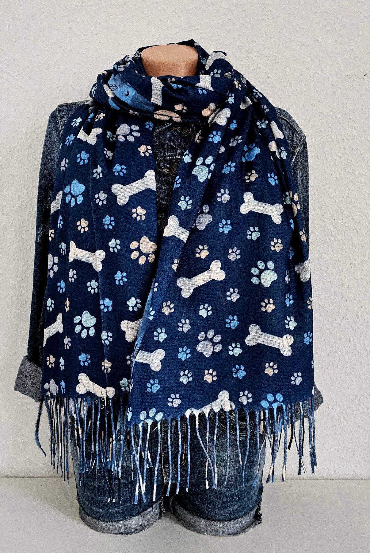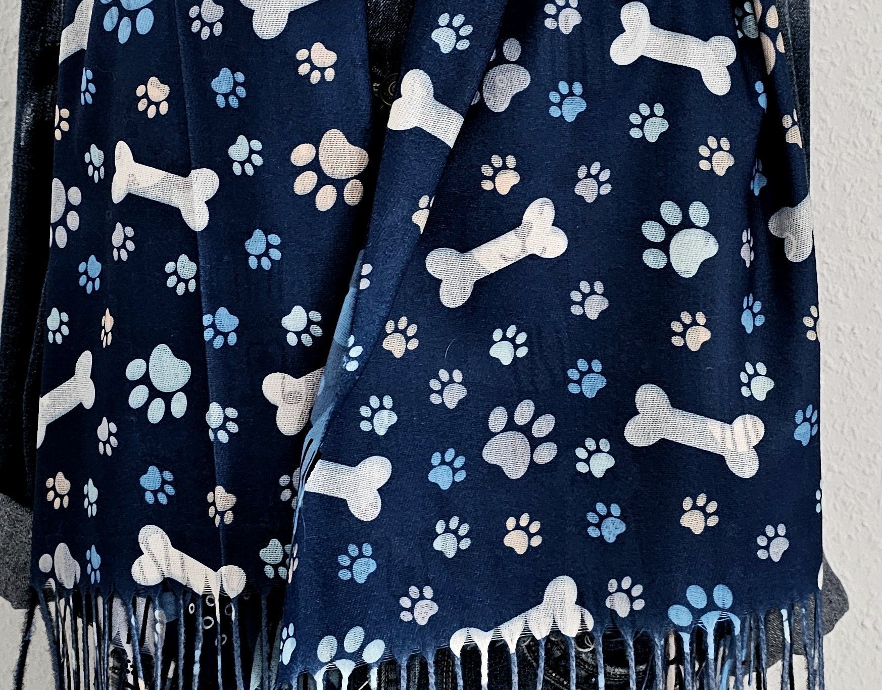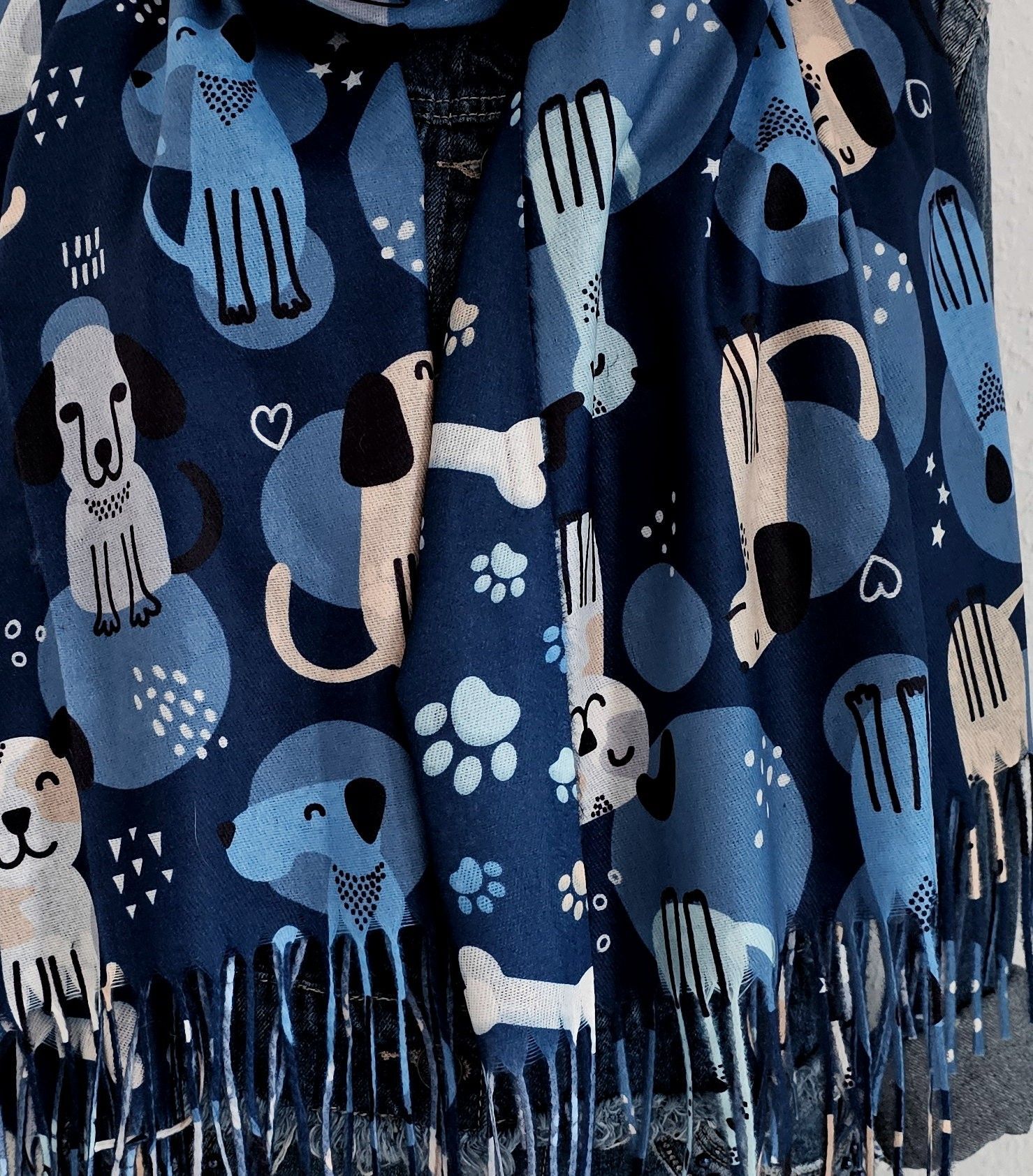 XL Winterschal Wendeschal Tuch Viskose bunte Hunde/ Knochen Fransen Blau/Bunt