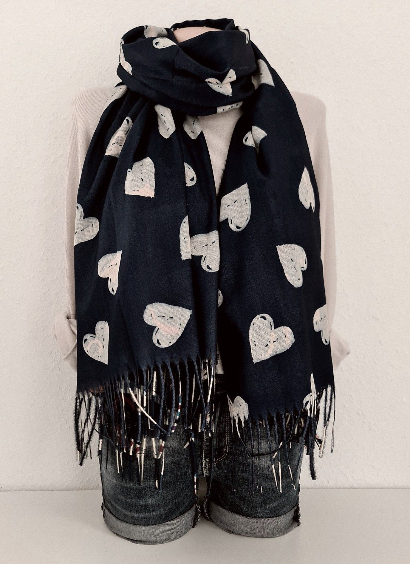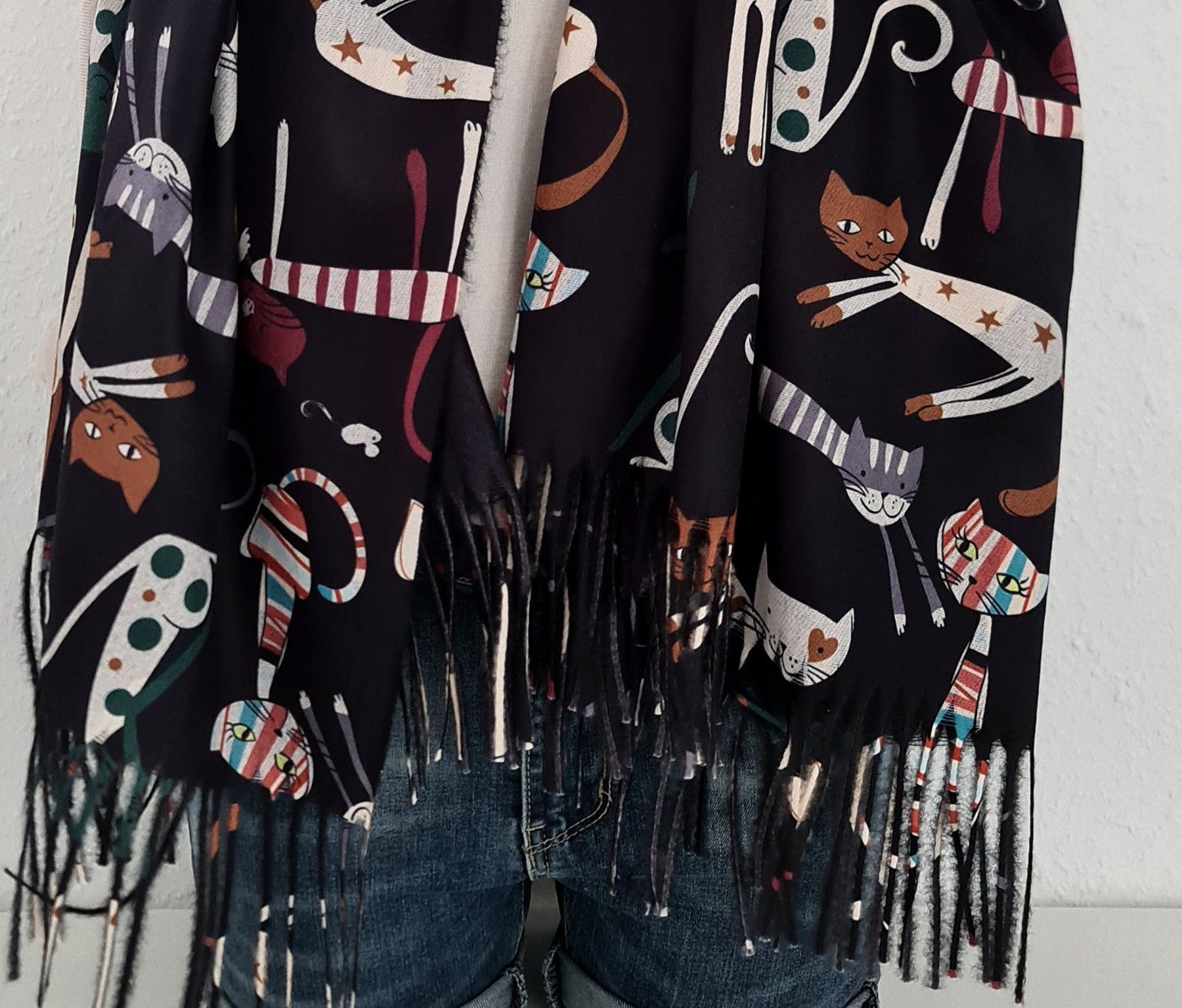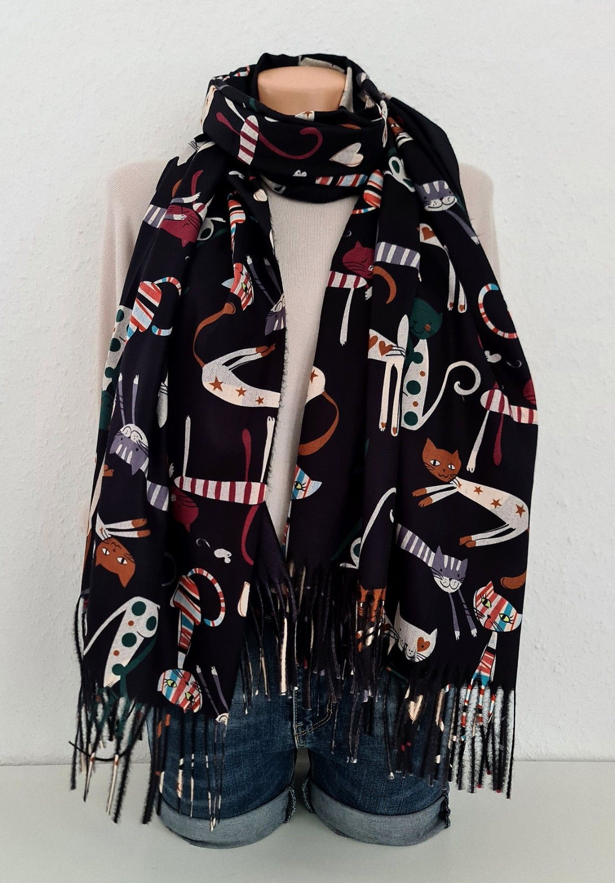 XL Winterschal Wendeschal Tuch weiche Viskose Katzen Herzen Fransen Schwarz