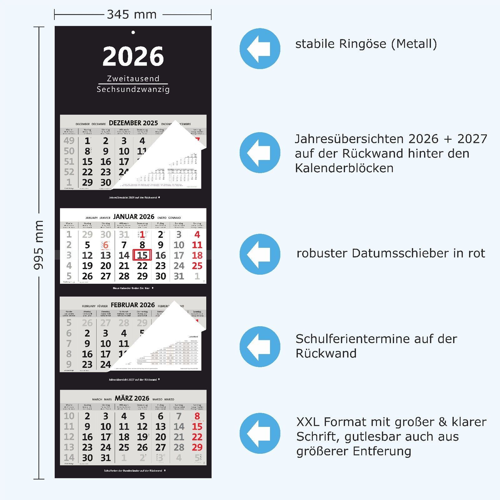 XXL 4-Monatskalender 2026 schwarz großer Wandkalender Bürokalender