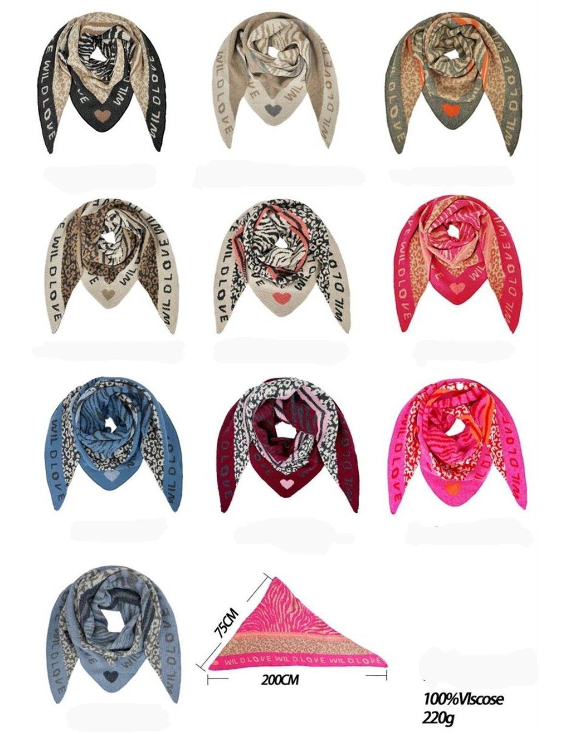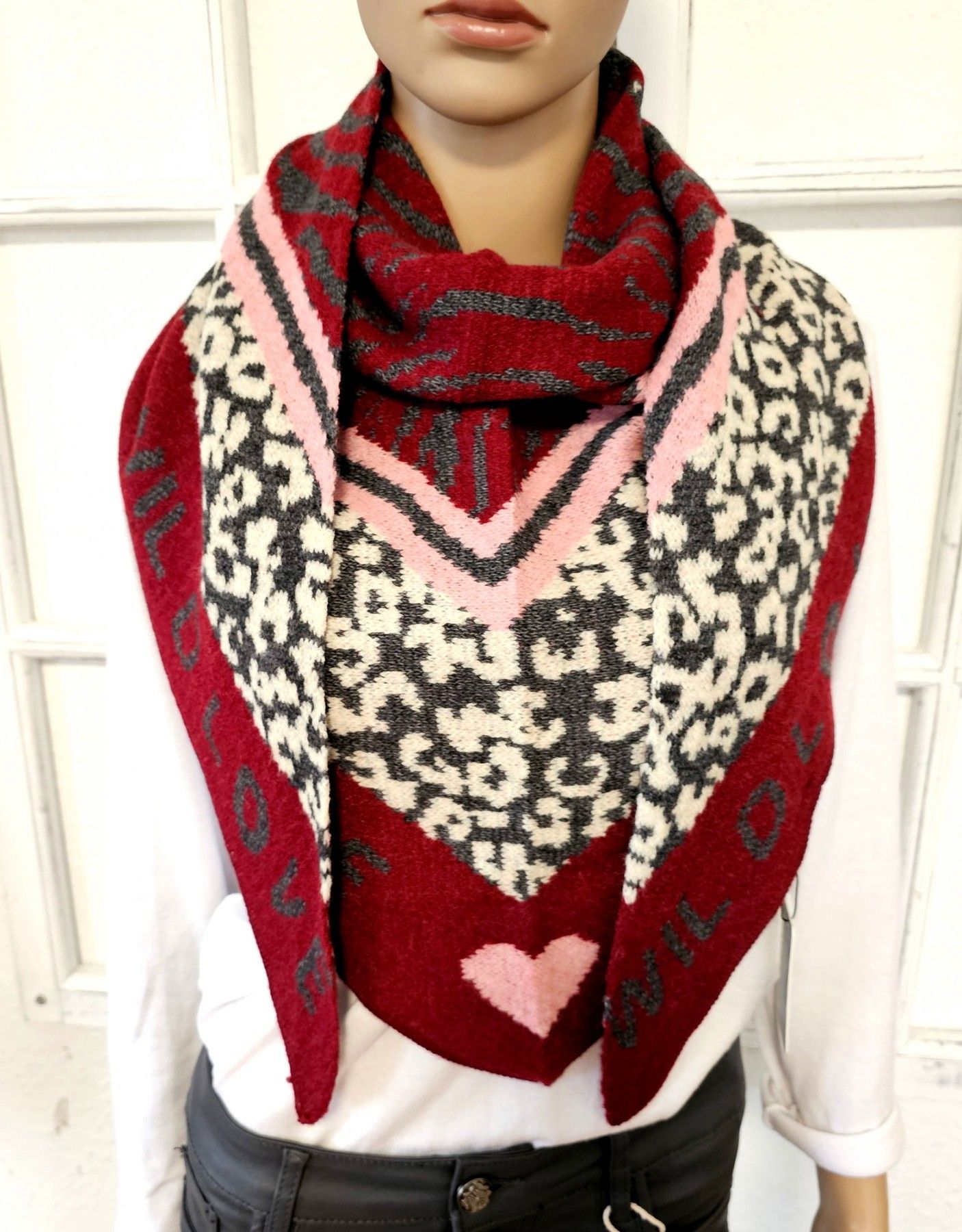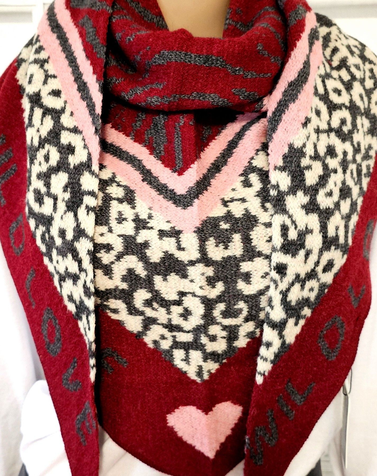 XXL Dreieckstuch Halstuch Schal Viskose Animal/Herz Schriftzug Dunkelrot/Rosa/Beige