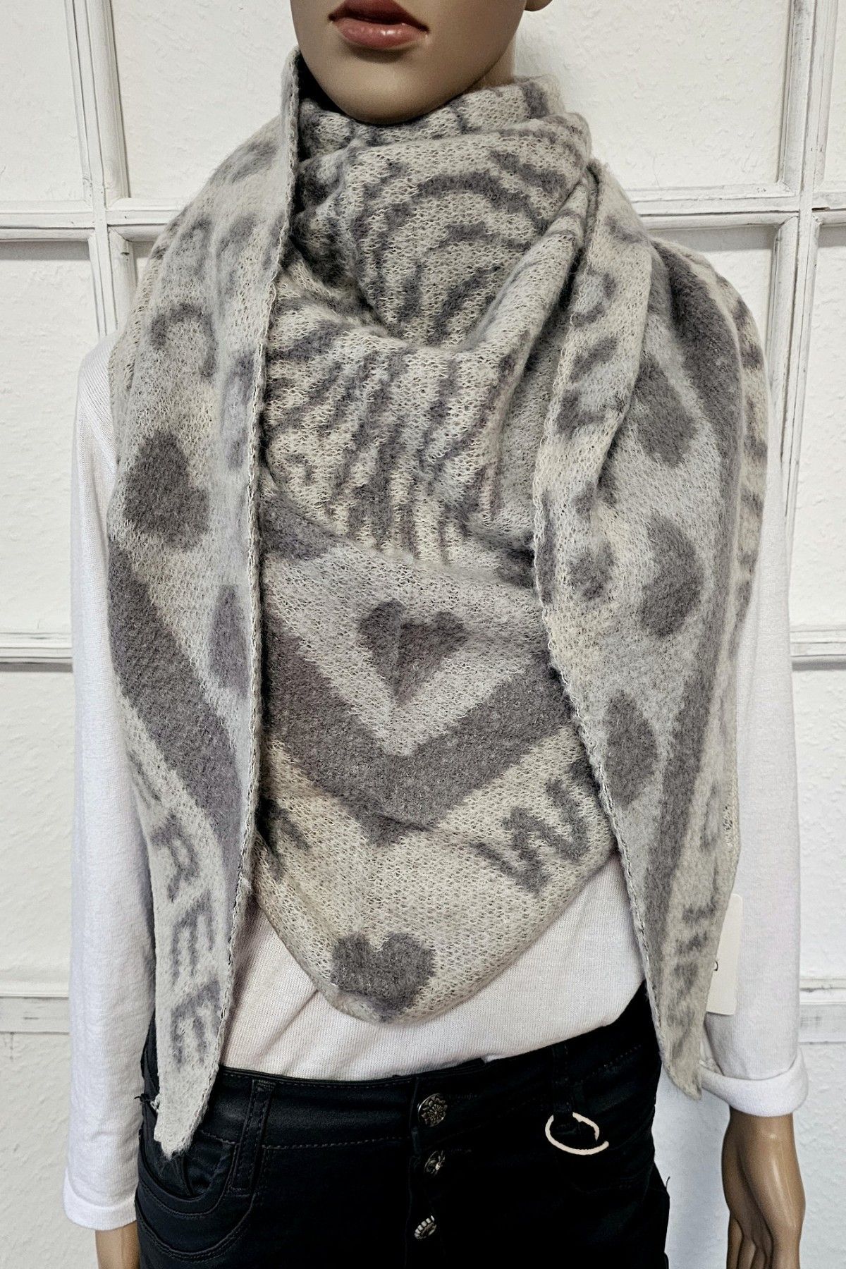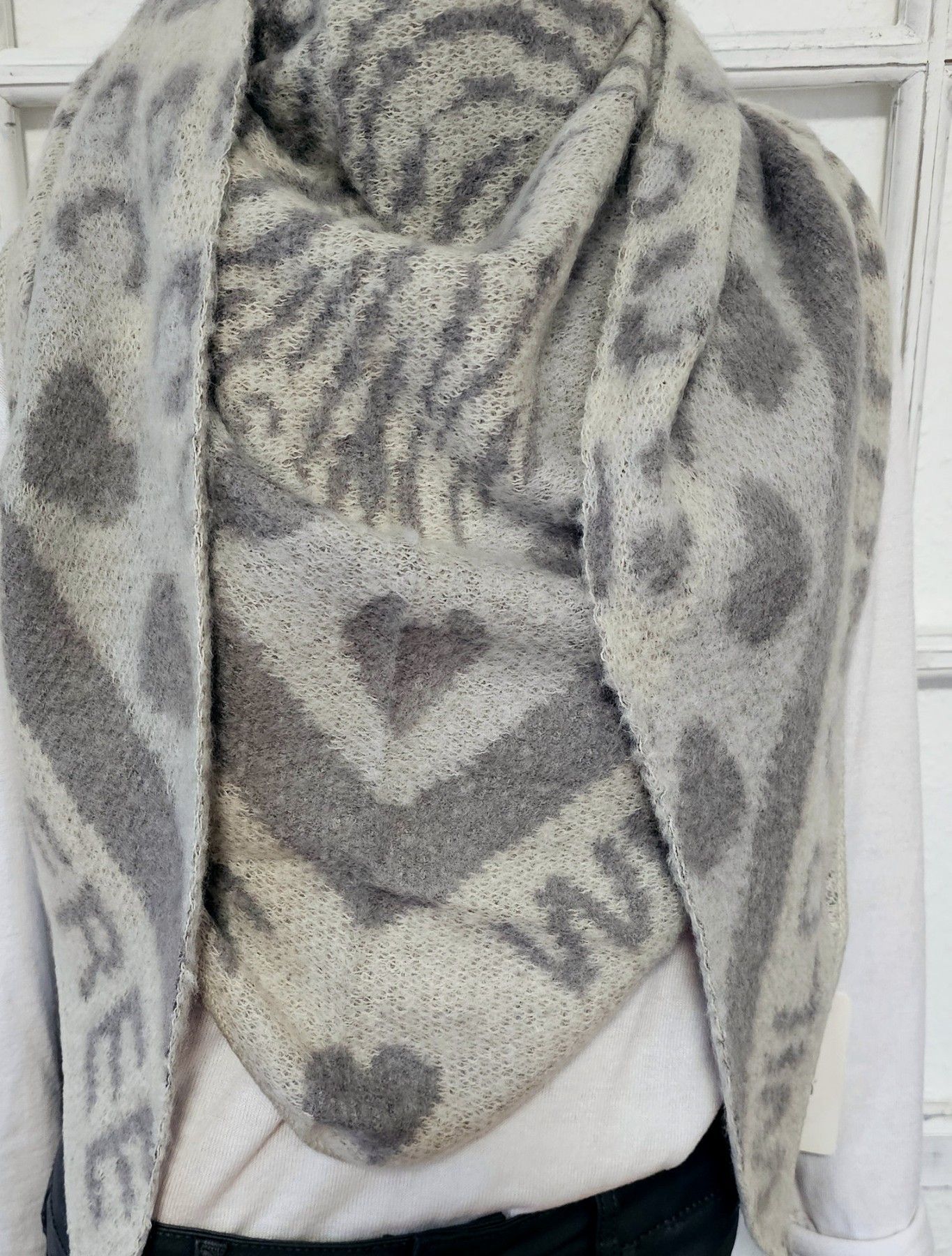 XXL Dreieckstuch Halstuch Schal Viskose Wolle Animal/Herzen Schriftzug Grautöne