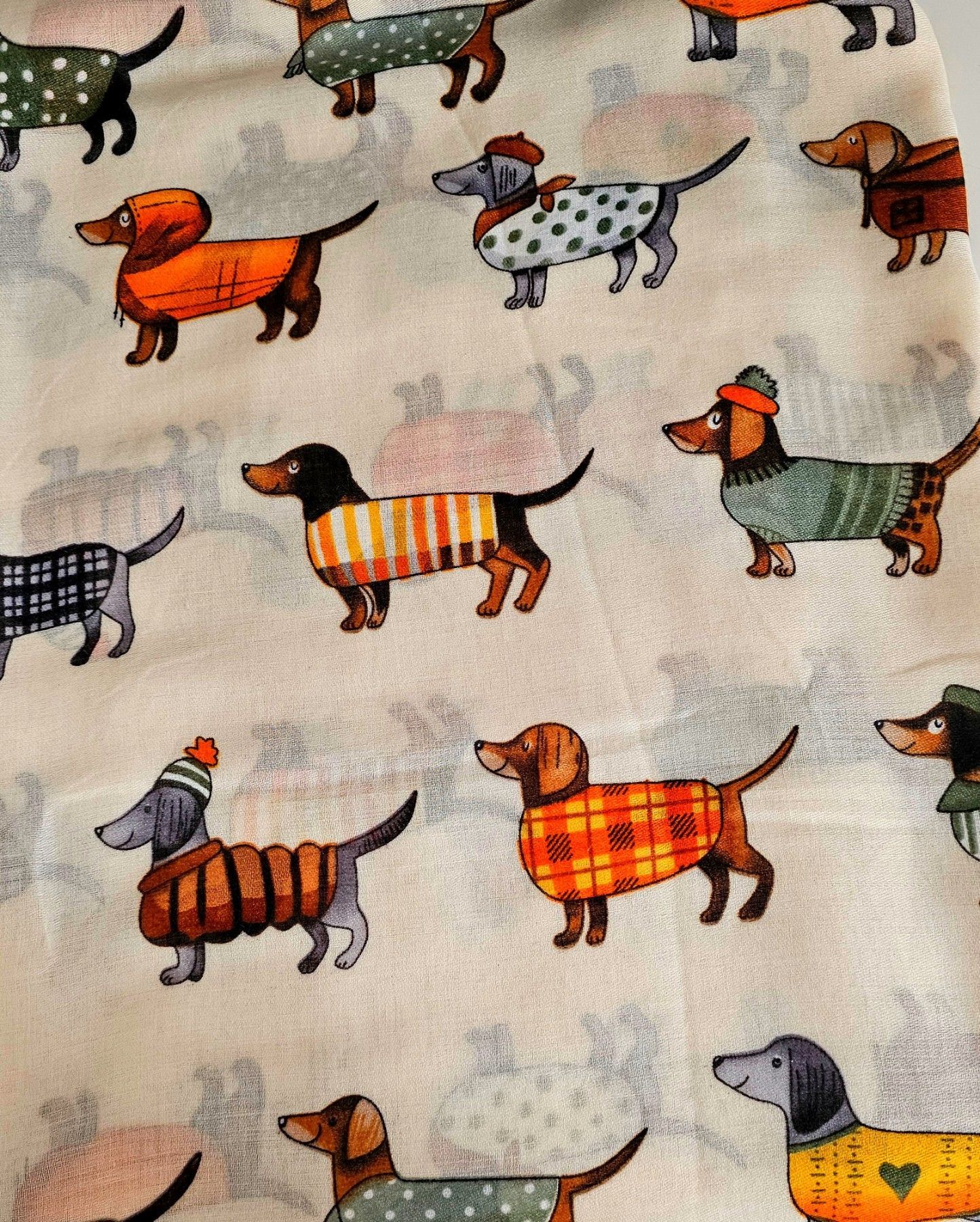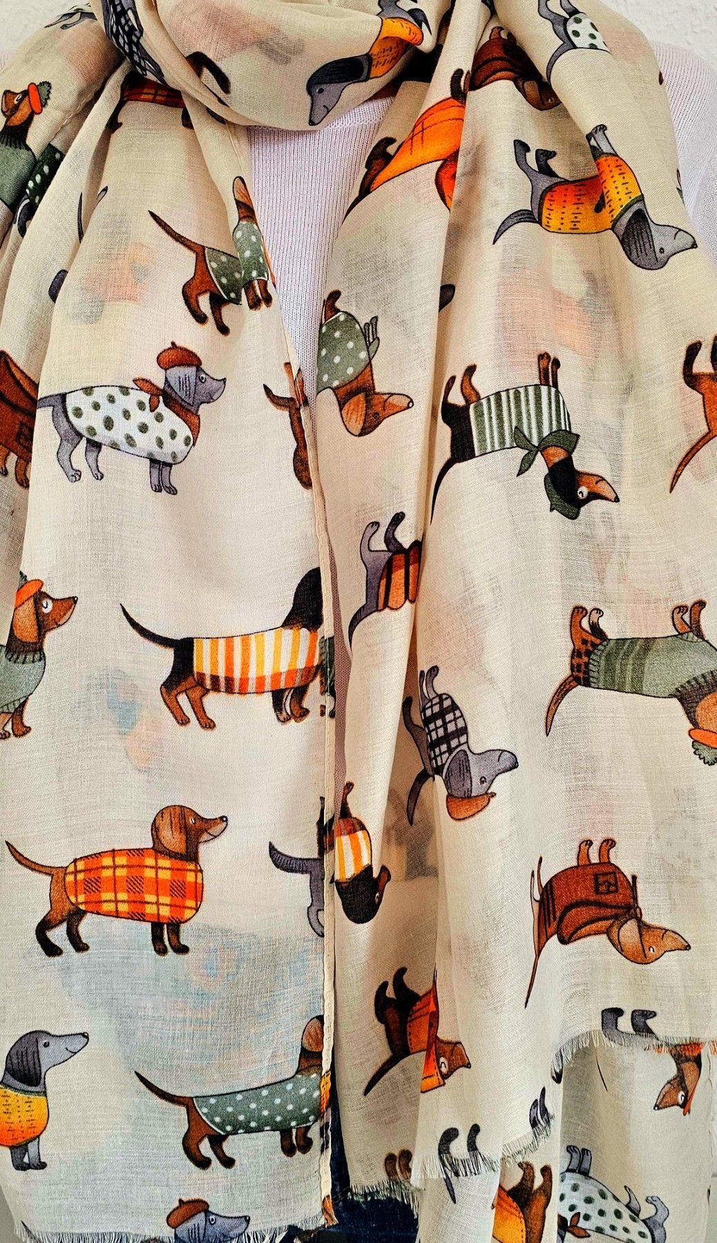 XXL Schal Halstuch Tuch Scarf Viskose/Baumwolle bunte kleine Hunde helles Beige