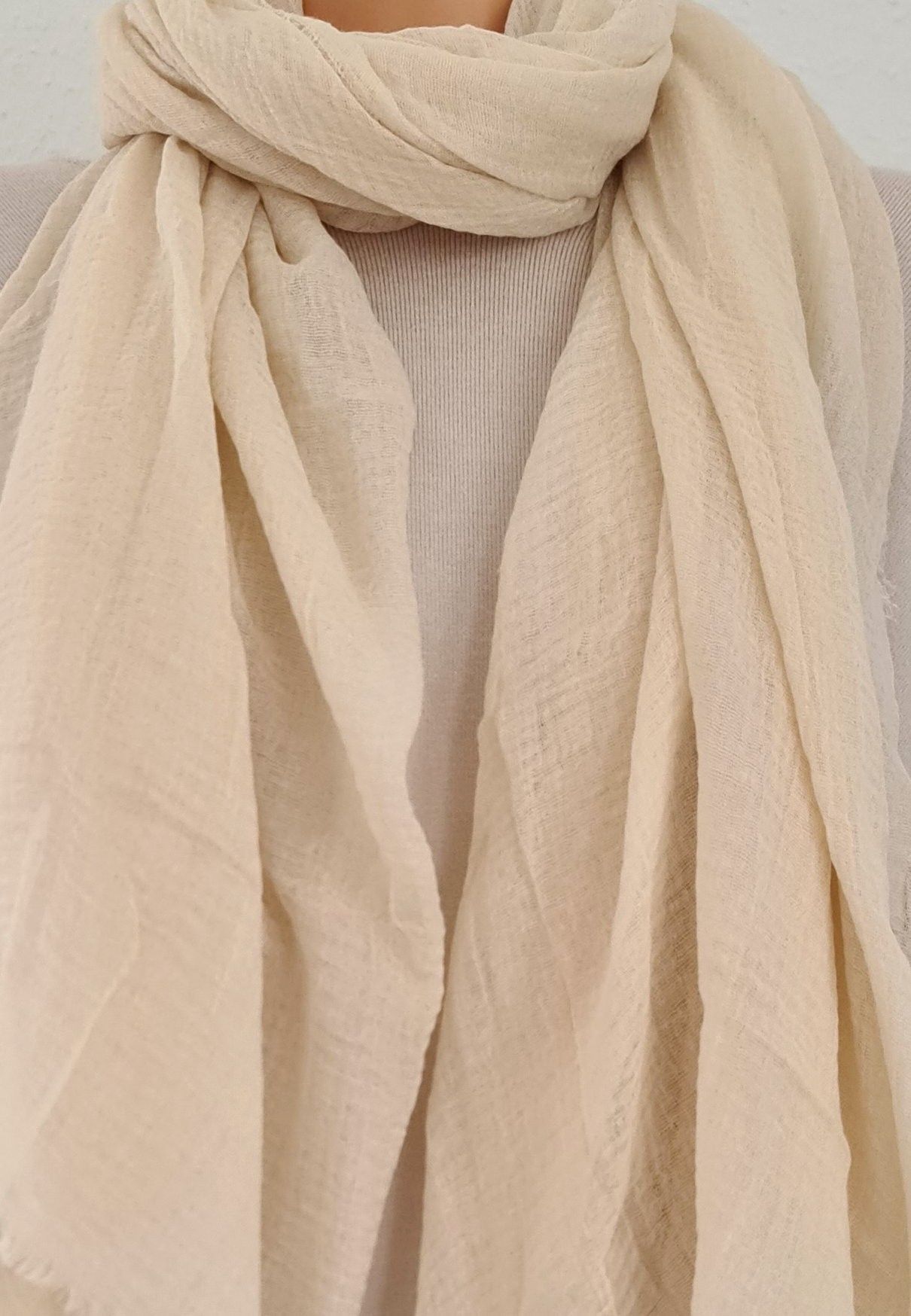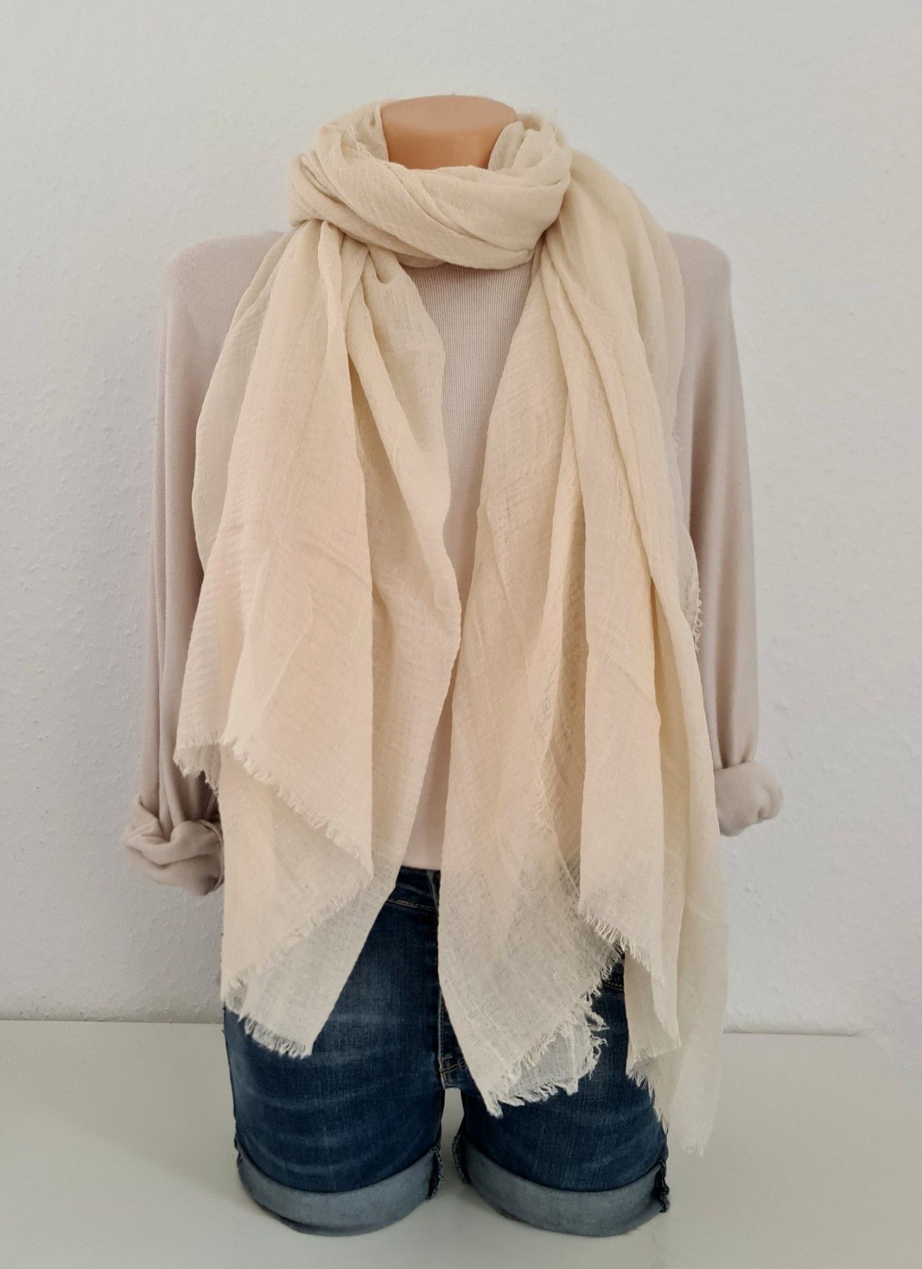 XXL Schal Tuch Halstuch Scarf Viskose Baumwolle kurze Fransen einfarbig Hellbeige