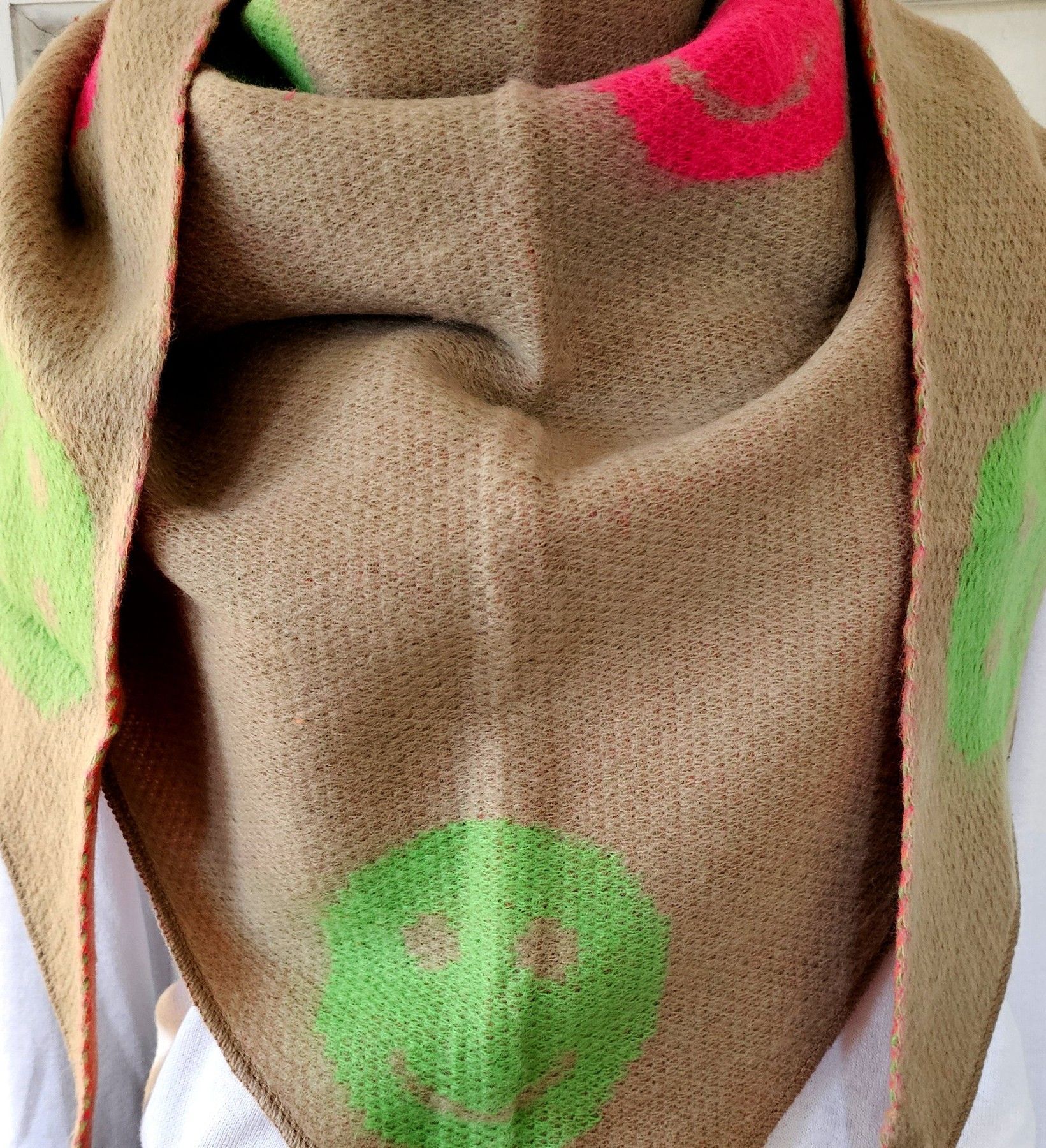 XXL Winter Flausch Dreieckstuch Schal Viskose Wolle bunter Smileyprint Taupe/Bunt