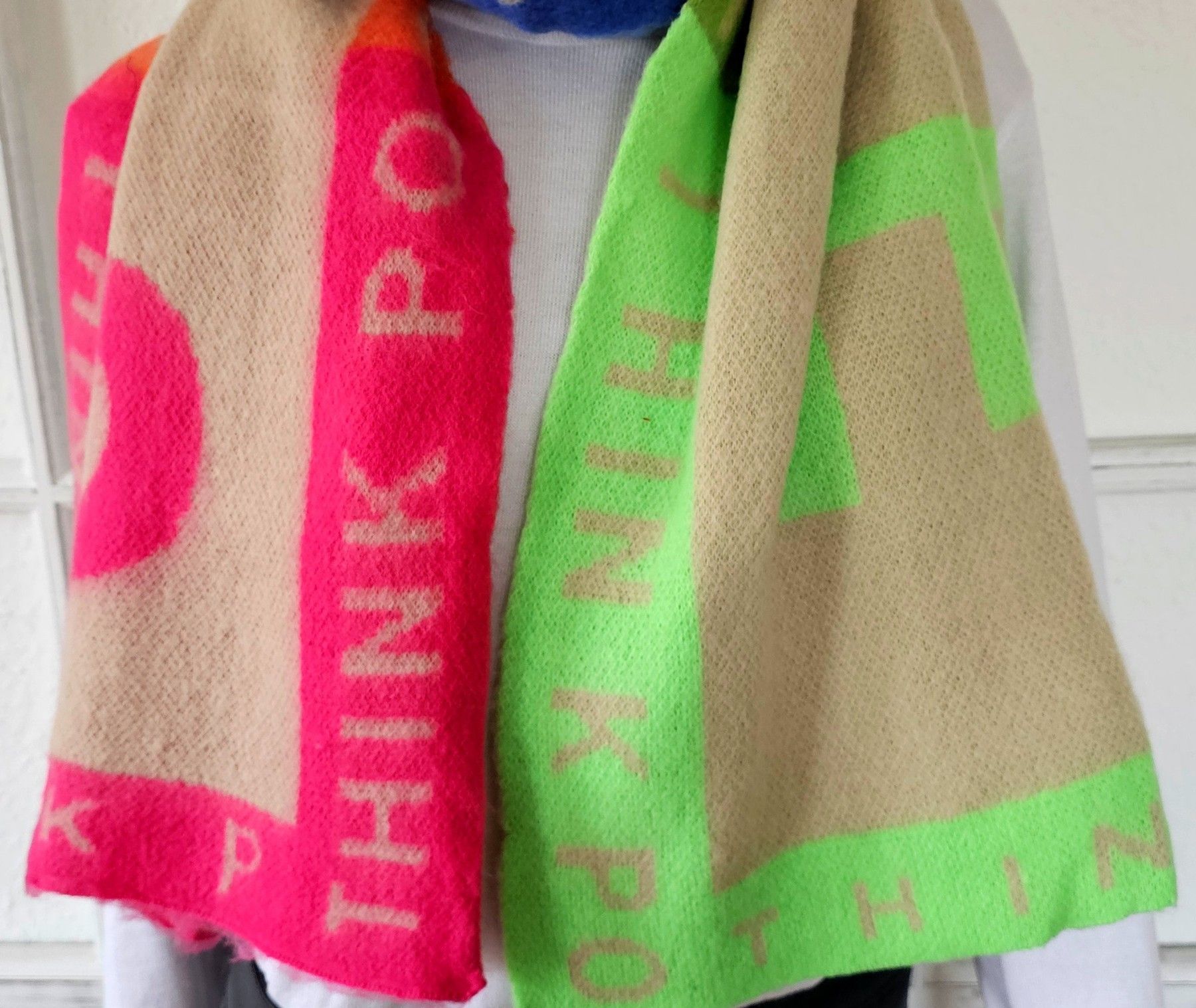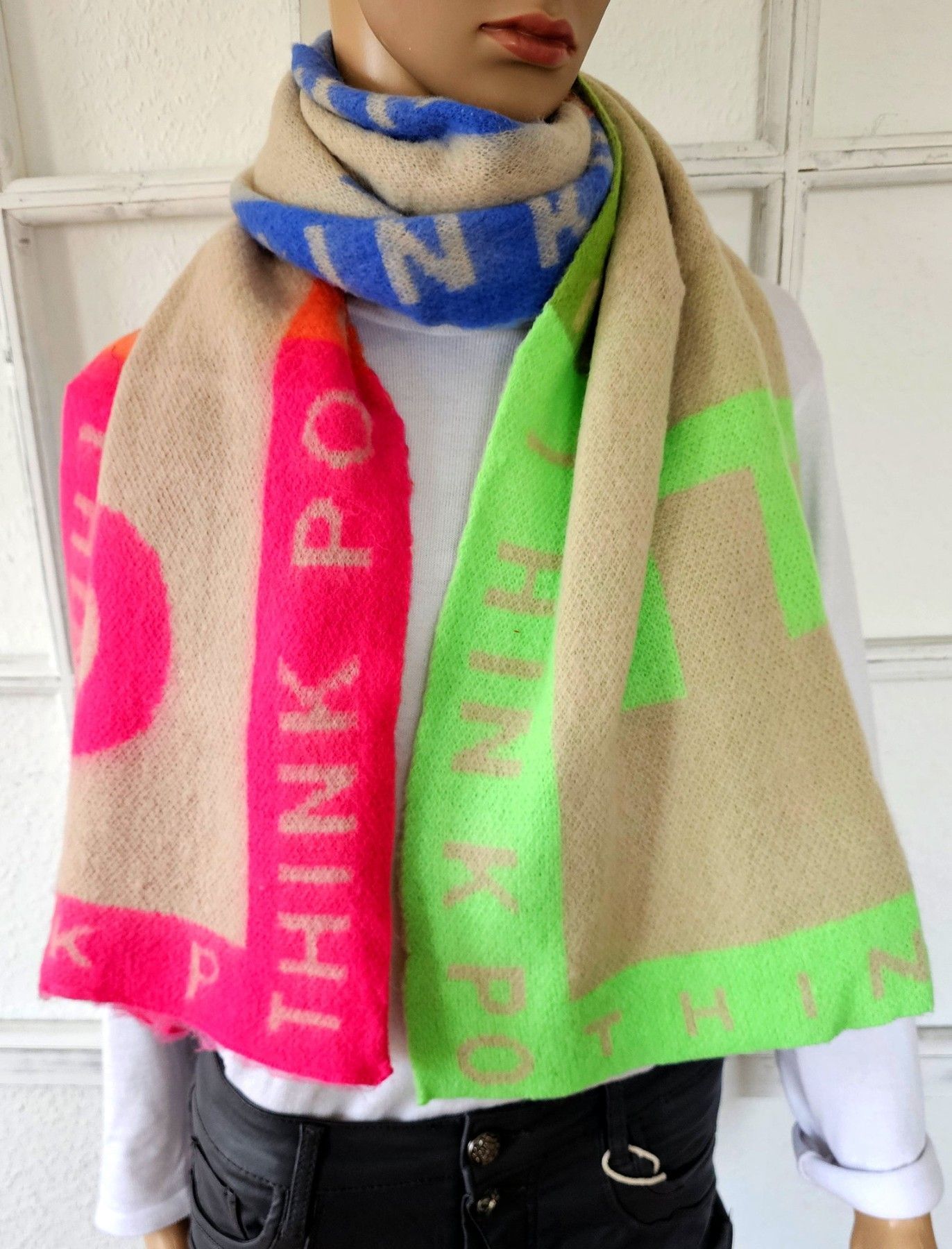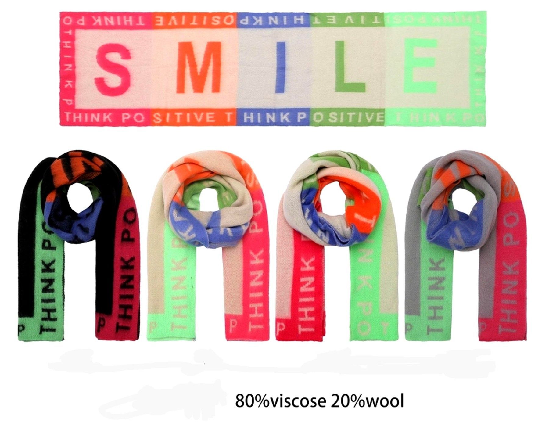 XXL Winterschal Halstuch 80 %Viskose 20 % Wolle Schriftzug SMILE Taupe/Bunt