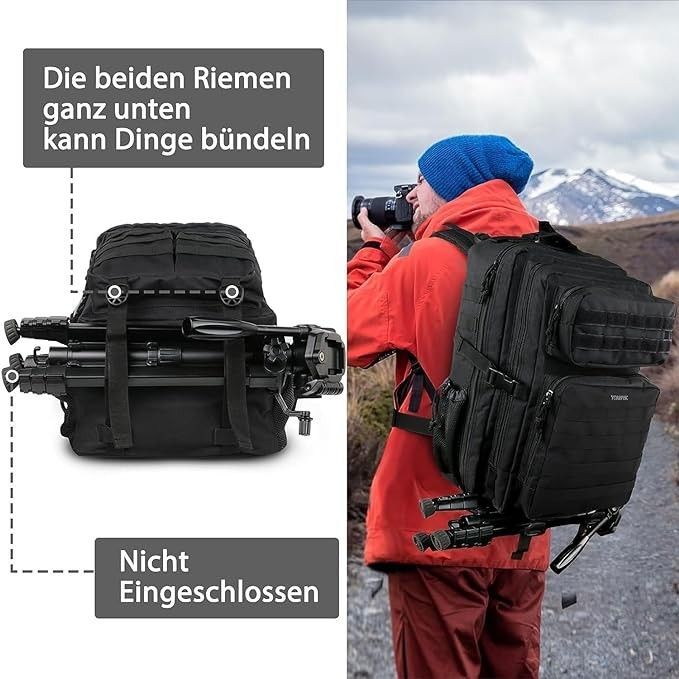 Große Kapazität: Der militärische Rucksack misst 30 x 30 x 50 cm (L x B x H) mit 45L Volumen, perfekt für Camping, Trekking, Reisen oder Arbeit. Geeignet für Männer und Frauen. Multifunktional: 3 Hauptfächer, 18 Innentaschen und ein großes Diebstahlschutzfach bieten Platz für Laptop, Kleidung und mehr. Seitenfächer für Wasserflaschen oder Regenschirme. MOLLE-System: Ermöglicht das Anbringen zusätzlicher Taschen oder Ausrüstung, Gurte für Zelt oder Isomatte.