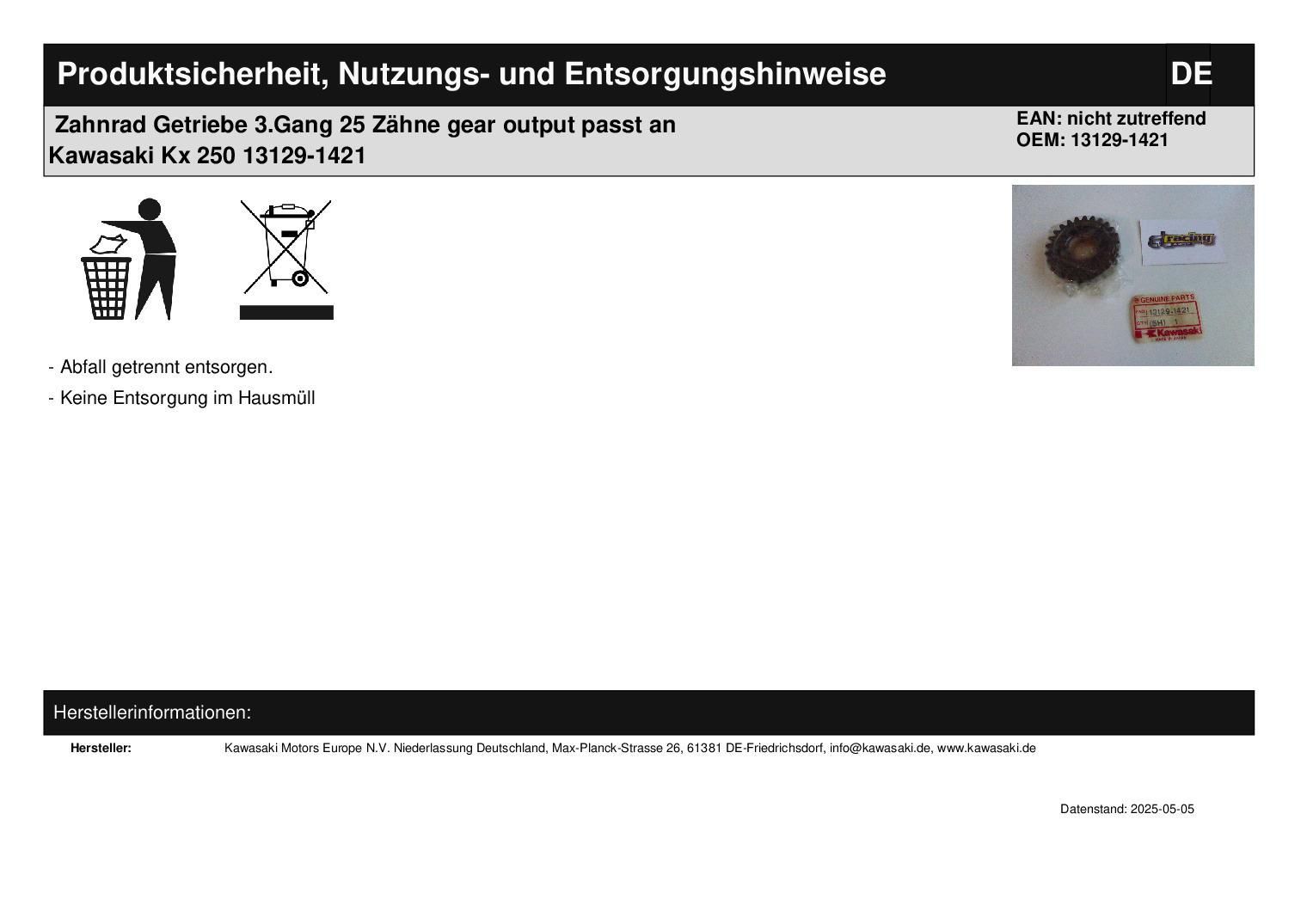 Zahnrad Getriebe 3. Gang 25 Zähne gear output passt an Kawasaki Kx 250 13129-1421