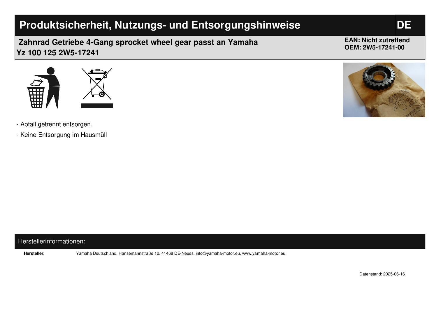 Zahnrad Getriebe 4-Gang sprocket wheel gear passt an Yamaha Yz 100 125 2W5-17241