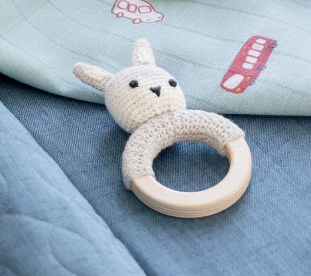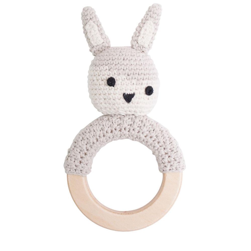sebra Zauberhafte Häkel-Rassel auf Holzring "Siggy HASE", aus Bio-Baumwolle, von sebra