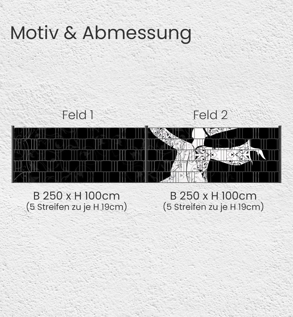 Teil1 - 9 Streifen - 250x180cm, Teil2 - 9 Streifen - 250x180cm, Teil1 + Teil2 - 9 Streifen - 500x180cm, Teil1 - 5 Streifen - 250x100cm