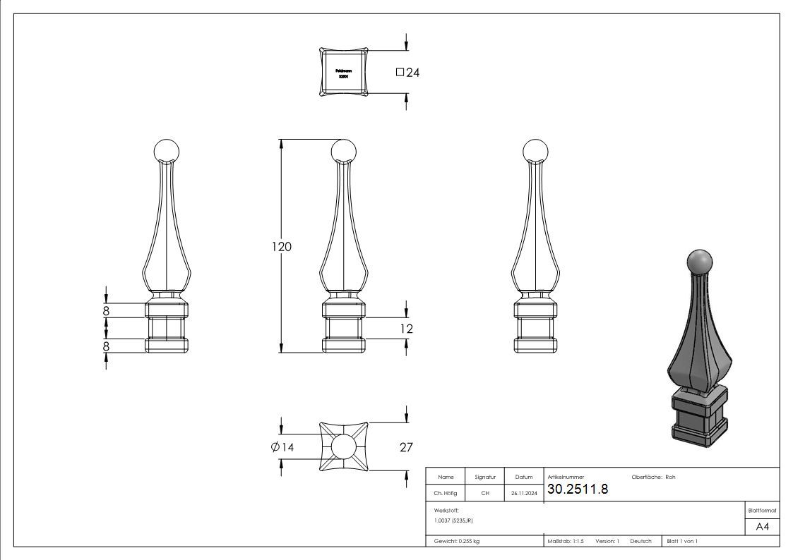 Zaunspitze | Höhe: 120 mm | Material: 24x24 mm | Stahl S235JR, roh