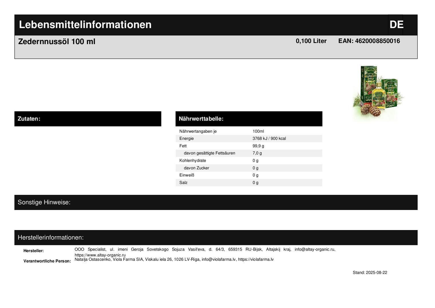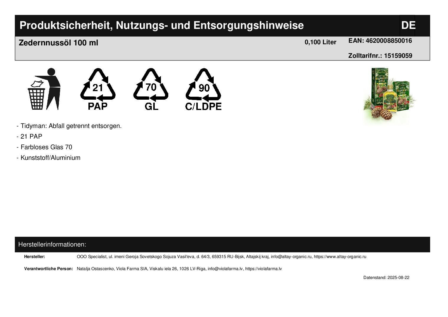 Zedernnussöl kaltgepresst Zedernussöl Zedernöl Altai Sibirien 100 ml