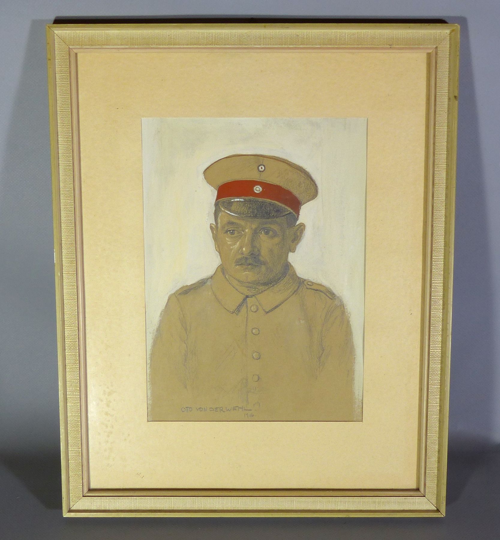 Original Zeichnung Gouache aus dem 1.Weltkrieg Gerahmt hinter Glas im Holzrahmen - wohl eine Neueinfassung der 60er Jahre Das Motiv zeigt einen Infantrist aus der Kaiserzeit (wahrscheinlich Hessen) Signiert ist das Bild vom Maler Otto von der Wehl mit Datierung 1916 Gesamtmaße ca. 40,5 x 32,5 cm Das