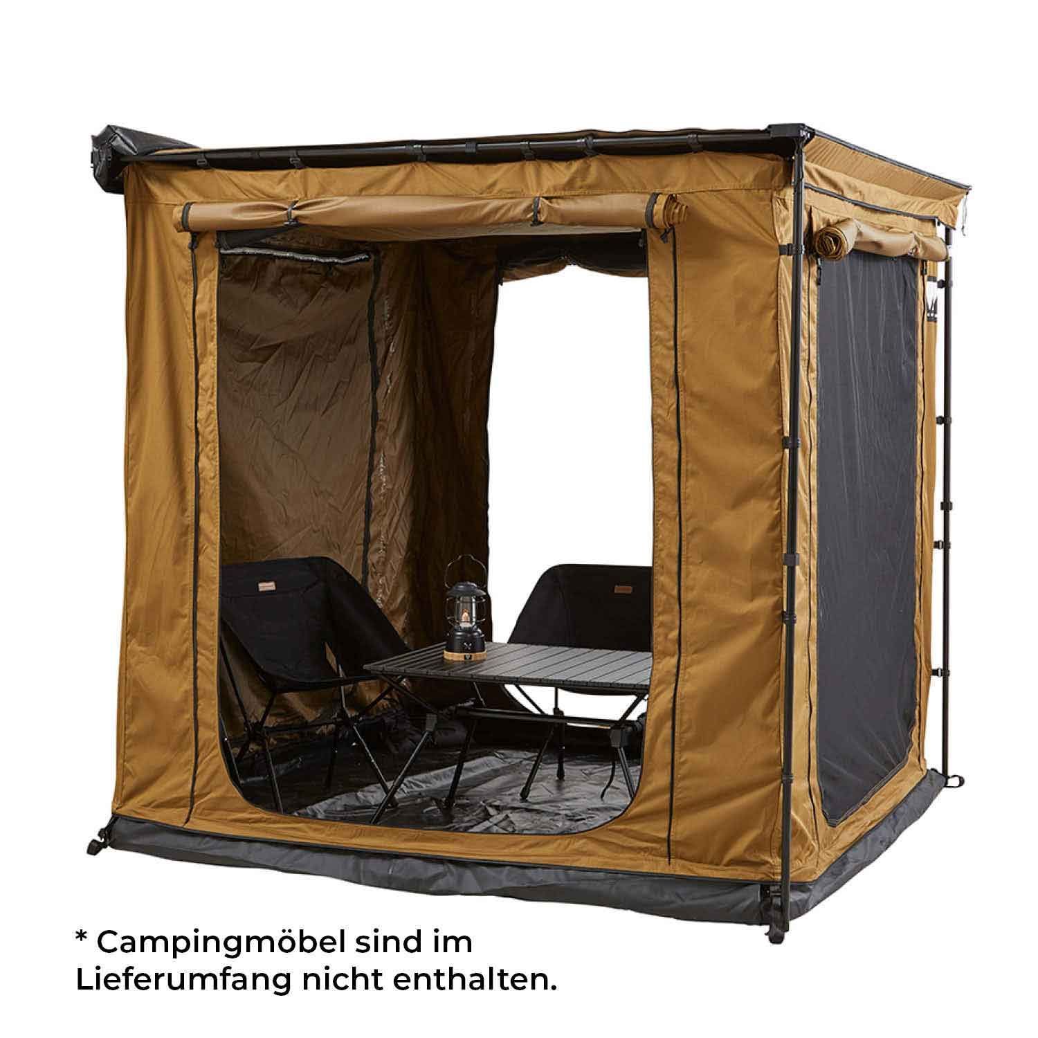 Der VICKYWOOD Zeltraum ist die optimale Schlecht-Wetter-Lösung für deine Markise Der Anbauraum, der an deiner VICKYWOOD Markise angebracht wird, liefert einen eigenen Raum mit Decke und Boden. Im Handumdrehen hast du einen wind- und wettergeschützten Raum geschaffen mit großzügigen Fenstern, welche mit flexiblen Moskitonetzen versehen sind. Der ideale Ort zum Kochen, Essen, für gesellige Runden oder einfach zum Verweilen wenn das Wetter mal nicht so mitspielt.