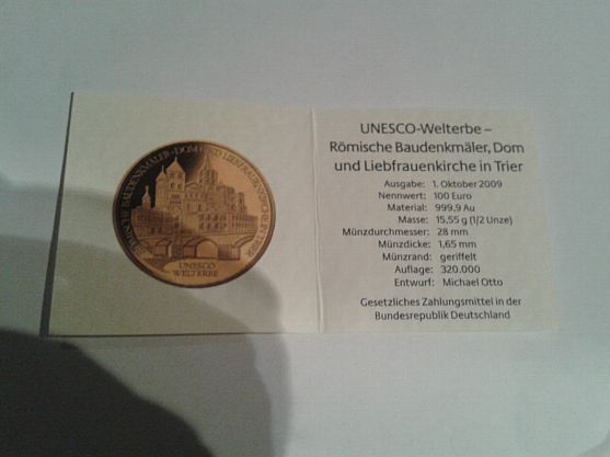 Zertifikat für 100 euro 2009 Unesco Trier Liebfrauendom 1/2 UNze Gold BRD Deutschland