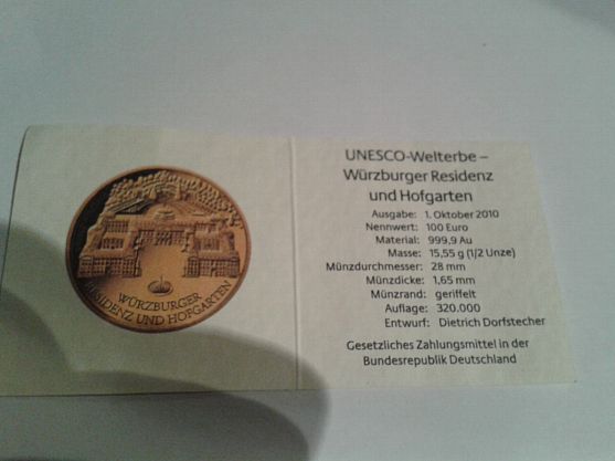 Zertifikat für 100 euro 2010 Unesco Würzburger Residenz 1/2 Unze Gold BRD Deutschland