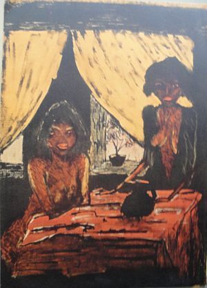 Zigeunermappe Otto Mueller: Zwei halbwüchsige Zigeunermädchen in der Hütte am Tisch