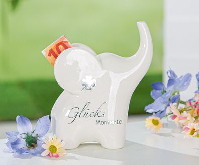 • Gilde Spardose, Elefant, "Elefant", Kleeblattmotiv, Spruch, Porzellan, weiß, VE