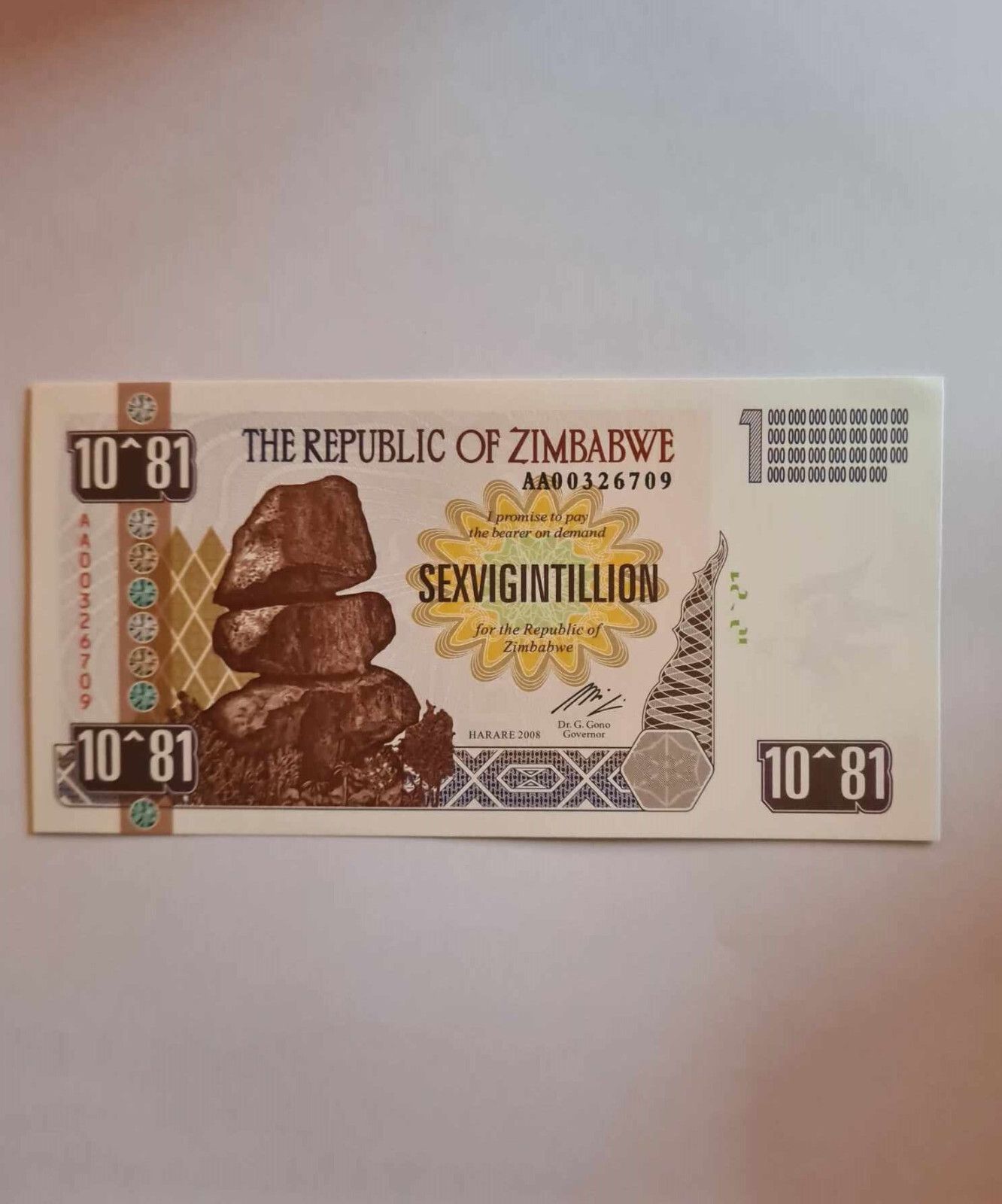 Banknoten - Zimbabwe - unzirkuliert und Bankfrisch - sehr selten Sexvigintillio n 10^81 Souvenir Jahrgang 2008 Dollar wie abgebildet Technische Information zum Artikel Die Seriennummern sind nicht identisch da jeder Schein eine andere hat Größe: ca. original Größe Erhaltung: Neu Verpackung: Folie Da