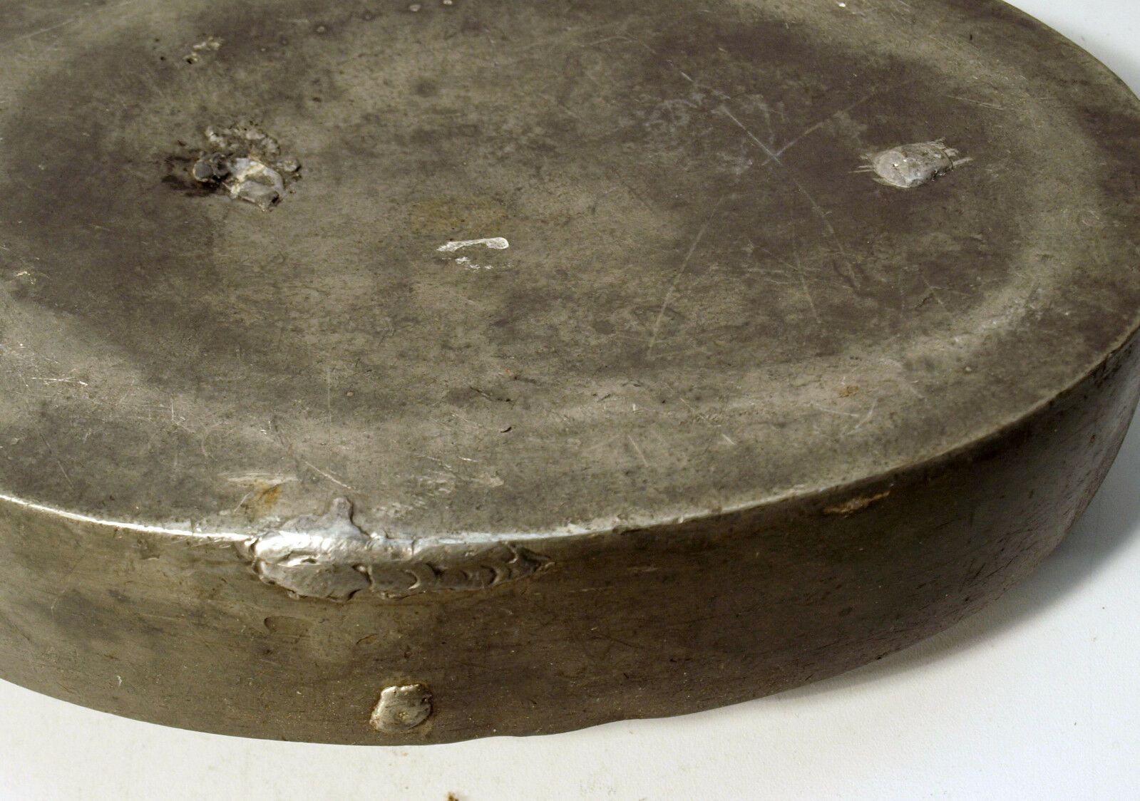 Wärmflasche um 1800. Ohne Marke. Material: Zinn. Mehrfach gelötet. Maße: L 29, B 20, H 8 cm. Antikes am Deich - Inh: Oliver Kipp-Trense G M T Sprache erkennen Afrikaans Albanisch Arabisch Armenisch Aserbaidschanisch Baskisch Bengalisch Bosnisch Bulgarisch Burmesisch Cebuano Chichewa Chinesisch (ver)
