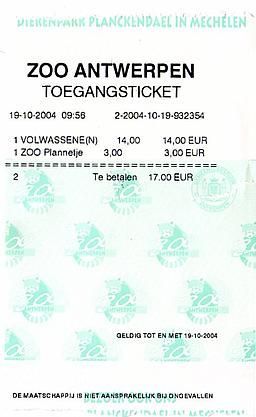 Zoo Antwerpen Belgien Eintrittskarte vom 19.10.2004