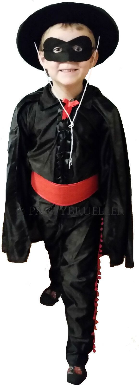 das Kostüm edler Retter besteht aus - einem schwarzen seidenen Hemd mit roter Schleife - einem schwarzen seidenen Umhang mit Klettverschluss - einer schwarzen Hose mit Gummizug und rot abgesetzter Borde - roten Gürtel mit Klettverschluss - Hut schwarz mit Aufschrift "Z" - schwarzer Augenmaske Größe: M Material: 100% Polyester empfohlenes Alter: 5 - 6 Jahre Degen für Zorro Kostüm Material: Kunststoff Länge: ca. 60 cm