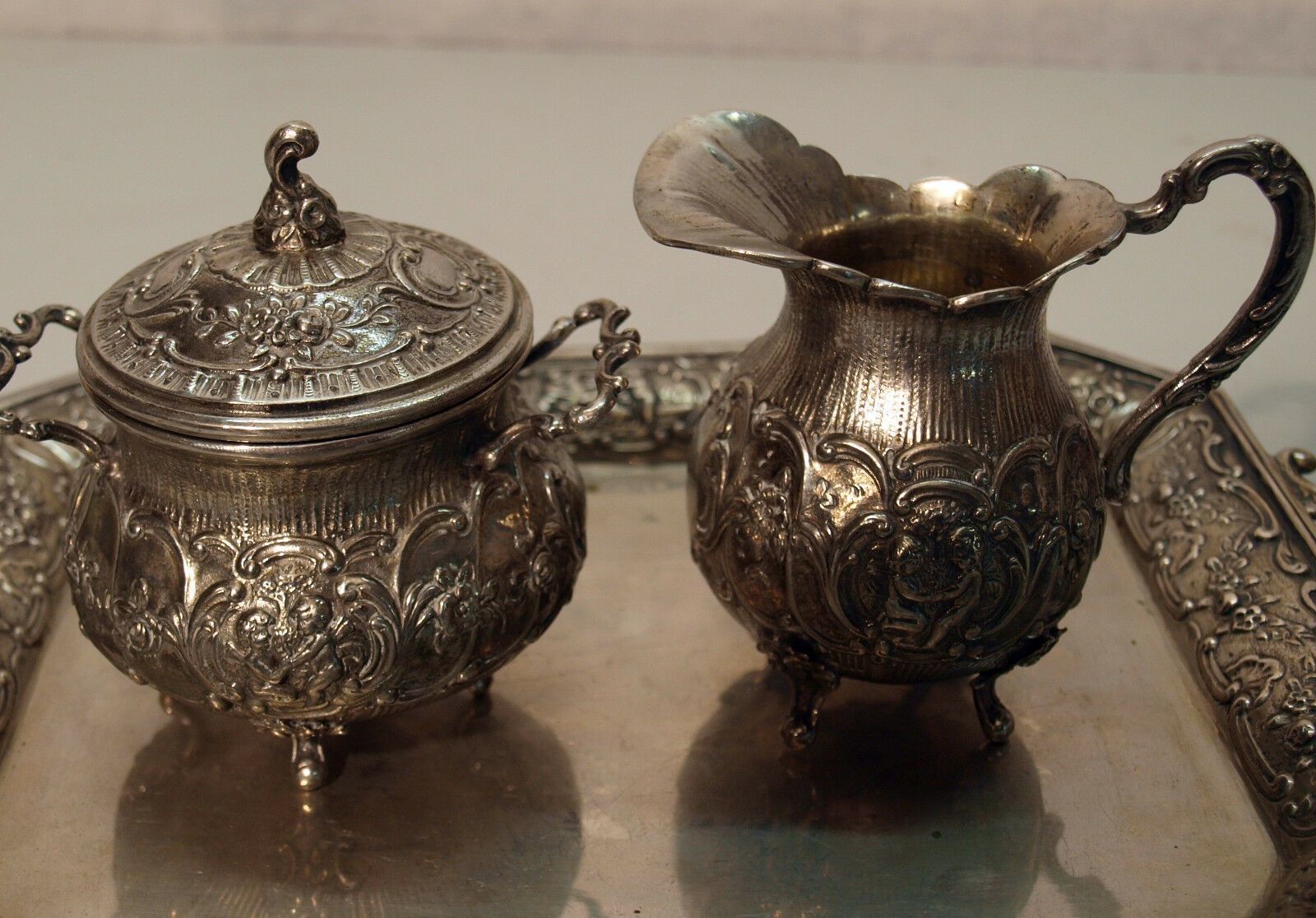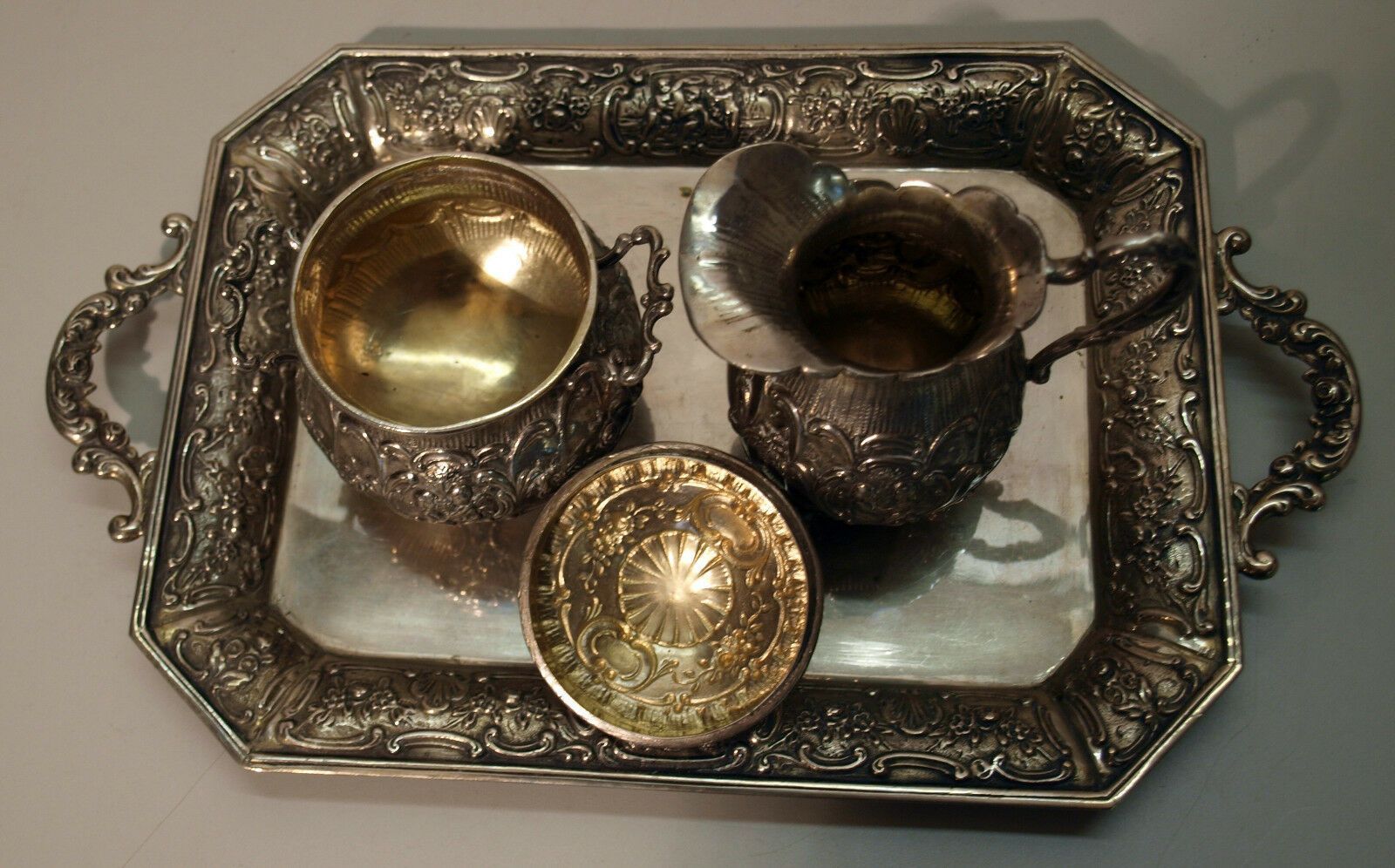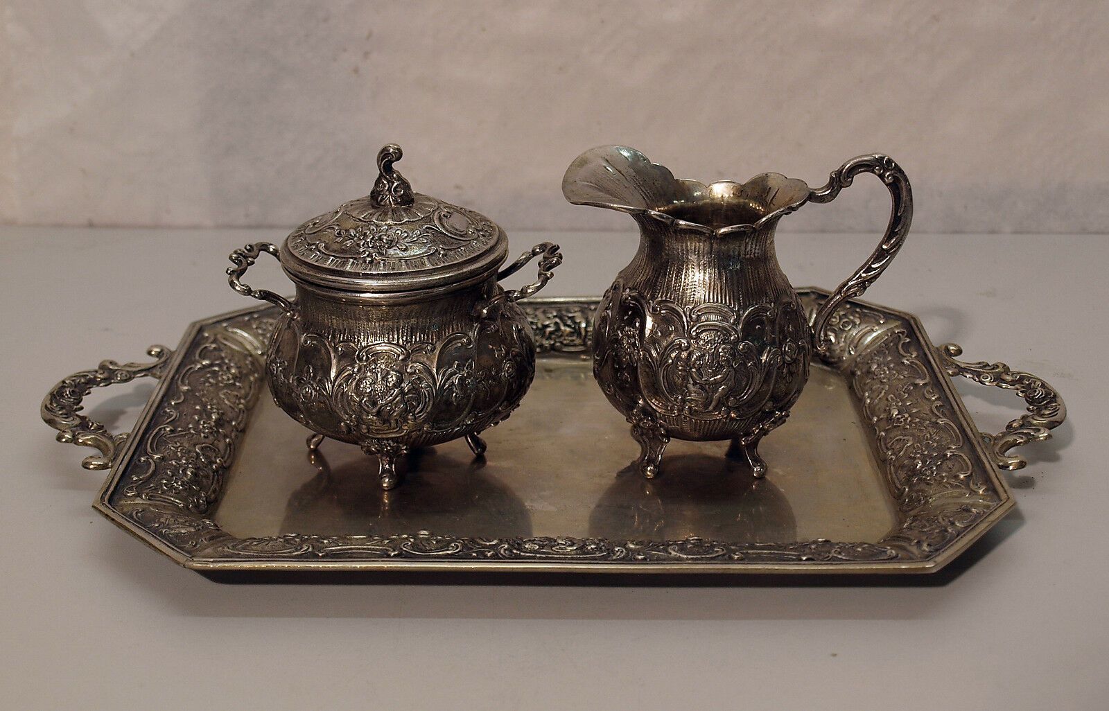 Schweres Zucker-Milch-Set um 1920. 800er Silber. Hildesheimer Rose . Besonders schwere Ausführung! Ungeputzt. Maße: Tablett L 32, B 19,5cm; Zuckerdose H 10 cm; 717 g. Schätzwert eines Hamburger Juweliers 1980: DM 5000,- (Brief anbei). Antikes am Deich - Inh: Oliver Kipp-Trense G M T Sprache erkennen