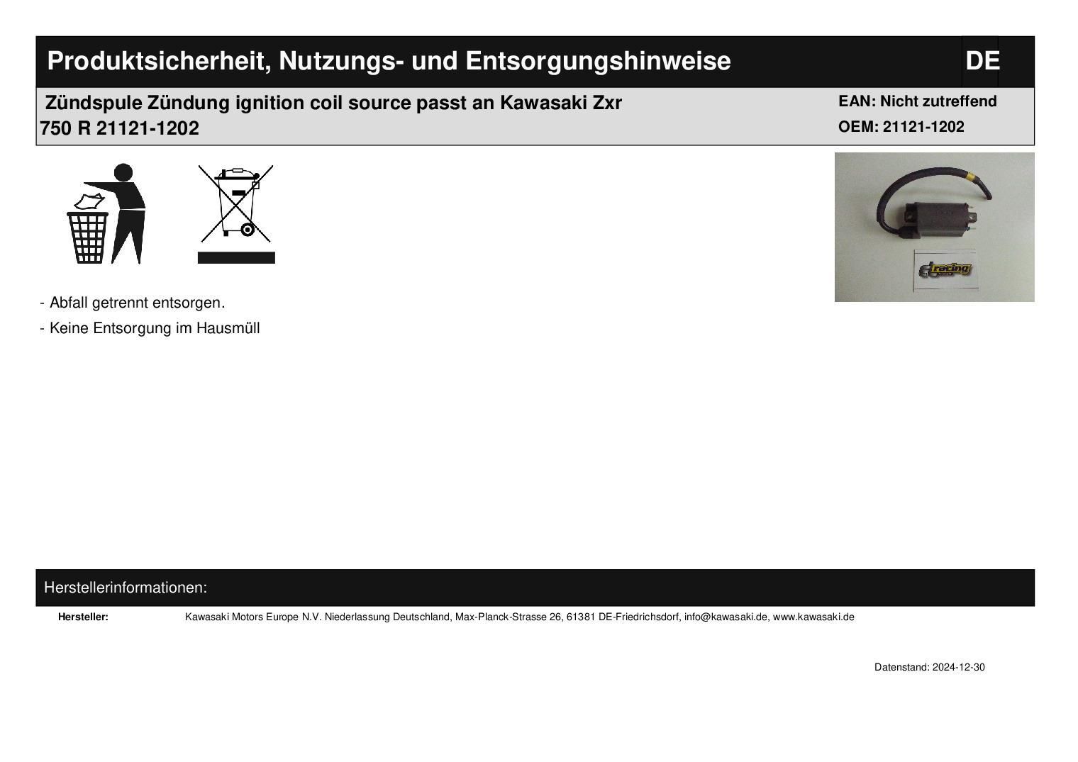Zündspule Zündung ignition coil source passt an Kawasaki Zxr 750 R 21121-1202 In dieser Auktion gibt es folgenden Artikel zu kaufen: Zündspule (siehe Foto) Modell: passend für Kawasaki ZXR 750 R Bj.: 1991 Lieferumfang: siehe Foto Artikelzustand: neu aus Geschäftsauflösung, mit leichten Lagerspuren;