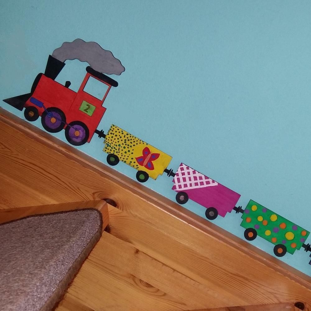 Zug, Lokomotive aus Holz 12 cm Hoch Der Zug ist aus stabilem 3 mm starkem Birken Sperrholz. Höhe: 12 cm Länge: 11,5 cm Material: Birken Sperrholz Farbliche Gestaltung: Posca Stifte, Acryl Farben
