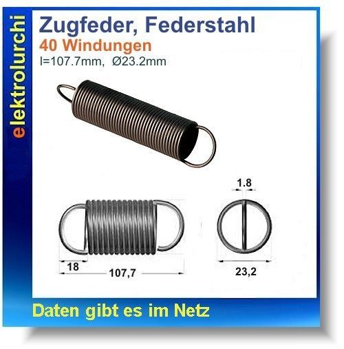 Sie bieten hier auf folgende Artikel NEU 1 Stück Zugfeder CrNi-Federstahl, l=107,70mm, Durchschitt23.3mm, Draht 1.80mm, 40 Windungen Die Zugfeder ist zylindrisch und wird aus runden Drähten mit konstantem Durchmesser gefertigt. Ihre Kennlinie ist linear wobei die Belastung längs der Federachse wirkt