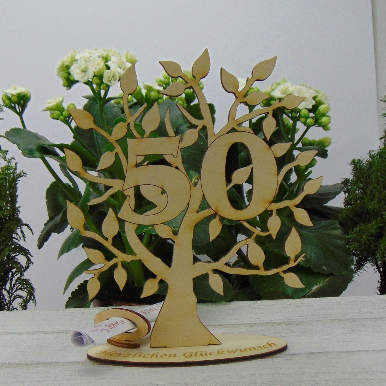Geld oder Gutscheingeschenk Lebensbaum mit der Zahl 50 Höhe 16 cm bestehend aus einer ovalen Unterplatte mit der Gravur " Herzlichen Glückwunsch " einen Geldscheinhalter und Gutscheinhalter und Face Schein der auf der Rückseite Zeilen hat für ihre persönlichen Worte.