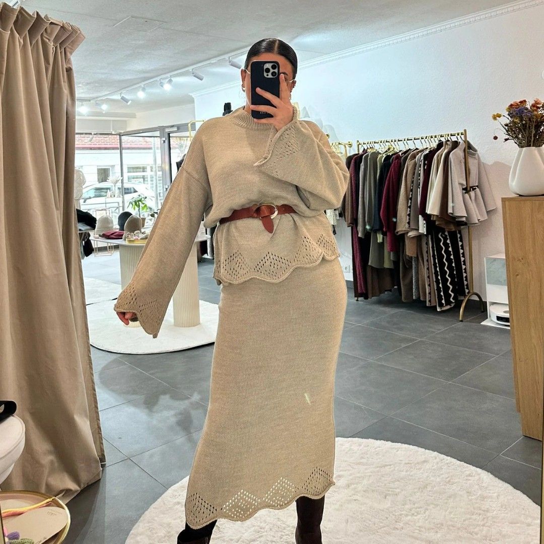 Zweiteiler Set Damen Lorena Beige Frauen Oberteil & Rock set Onesize XS-XL Frau