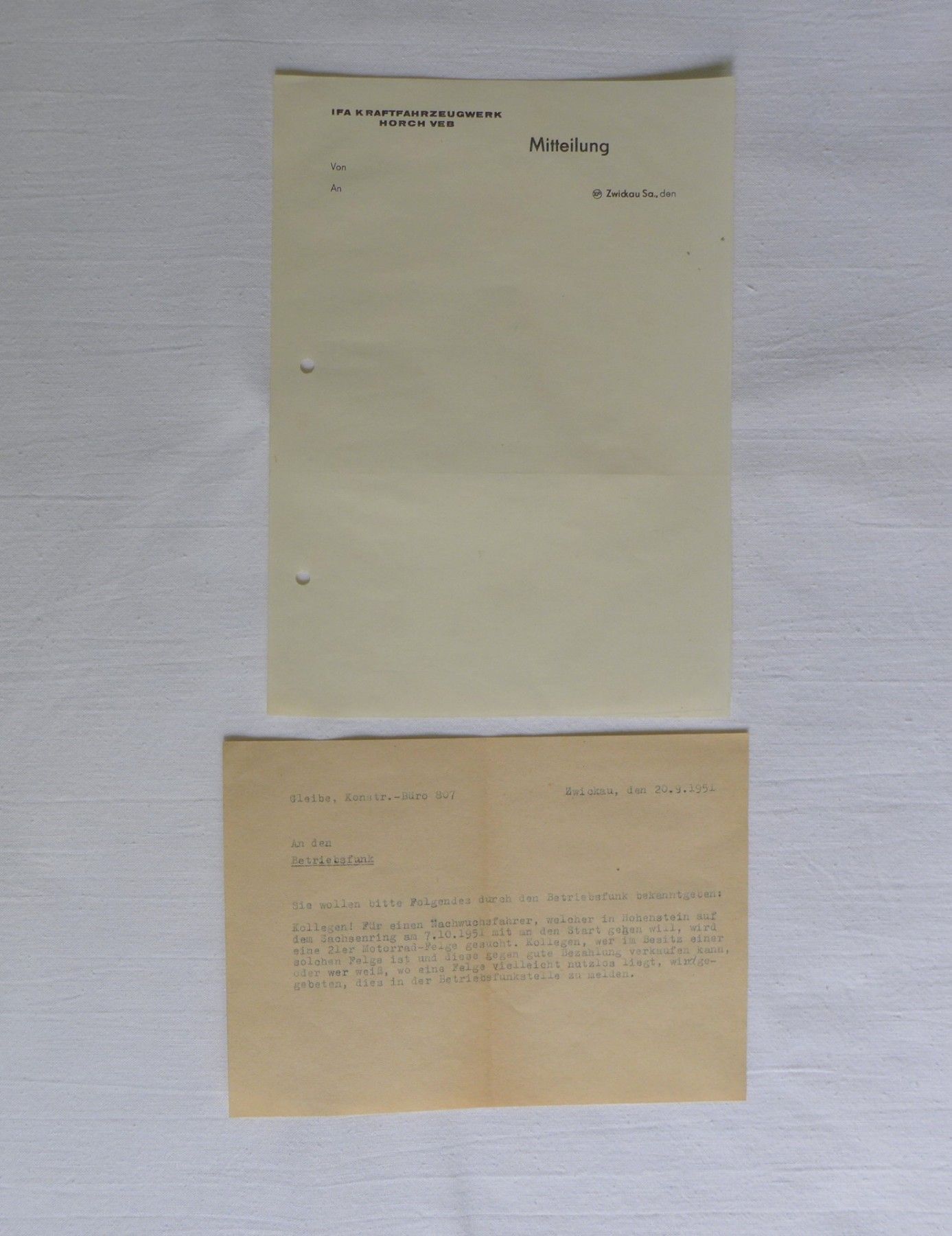 Zwickau Horch Konstruktionsbüro Betriebsfunk Hohenstein - E. Sachsenring Motorrad