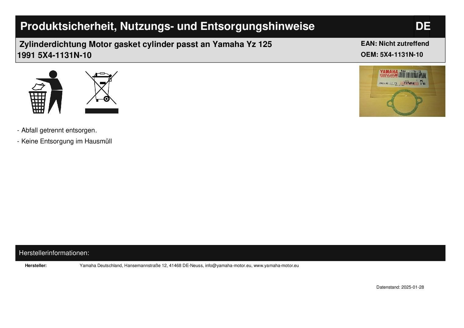 Zylinderdichtung Motor gasket cylinder passt an Yamaha Yz 125 1991 5X4-1131N-10