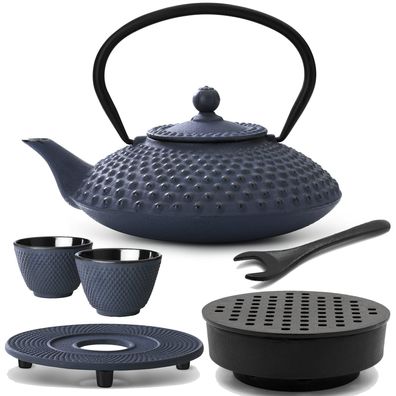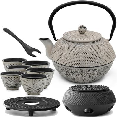 Teekanne Guss 1.1 L grau Tee-Set 6 Becher Untersetzer Stövchen mit Deckelheber