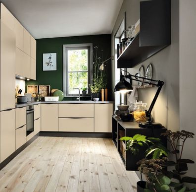 Beispiel Küchenzeile Einbauküche 300 cm beige matt Fronten schwarze Griffleisten