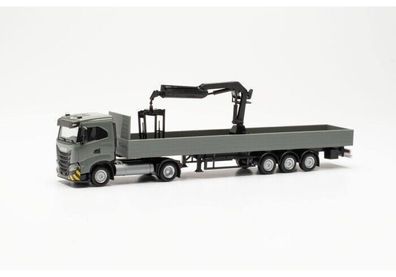 Herpa 316415 | Iveco S-Way ND LNG Pritschen-Sattelzug mit Ladekran | grau/gelb