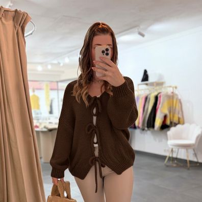 Damen Strickjacke Cardigan mit Schleifen Sophia DunkelBraun, Onesize (XS-XL) Frauen