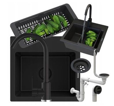 Granitspüle Schwarz FERRUM 49x45cm, SET 7 in 1, Armatur Siphon