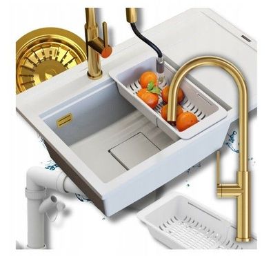 RENDO Granitspüle Weiß gebrochen 80x50 cm 1 Becken Set 5-in-1 mit Armatur EU