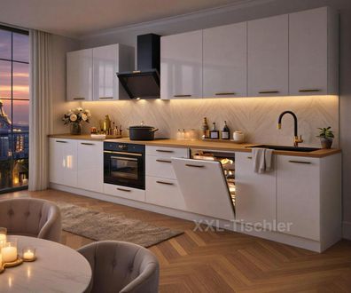 Küchenzeile Emma 340 cm DW MDF Weiß Hochglanz- Küche 3,4m, mit Arbeitsplatte