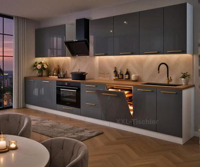 Küchenzeile Emma 340 cm DW MDF Grau Hochglanz- Küche 3,4m, mit Arbeitsplatte