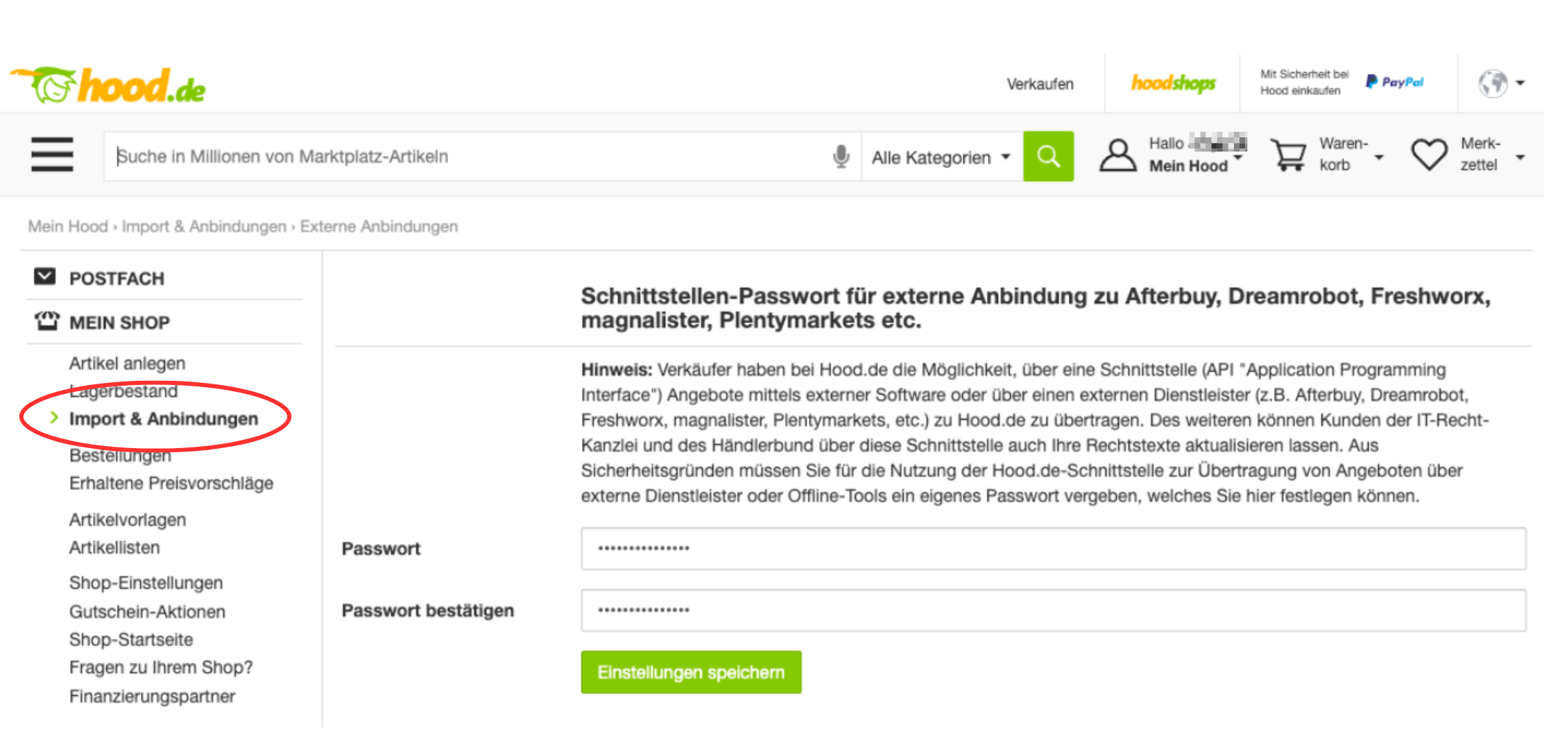 - Erstellen Sie jetzt ein separates Passwort, das ausschließlich für die Anbindung Ihres Hood-Shops zu anderen Systemen genutzt wird.