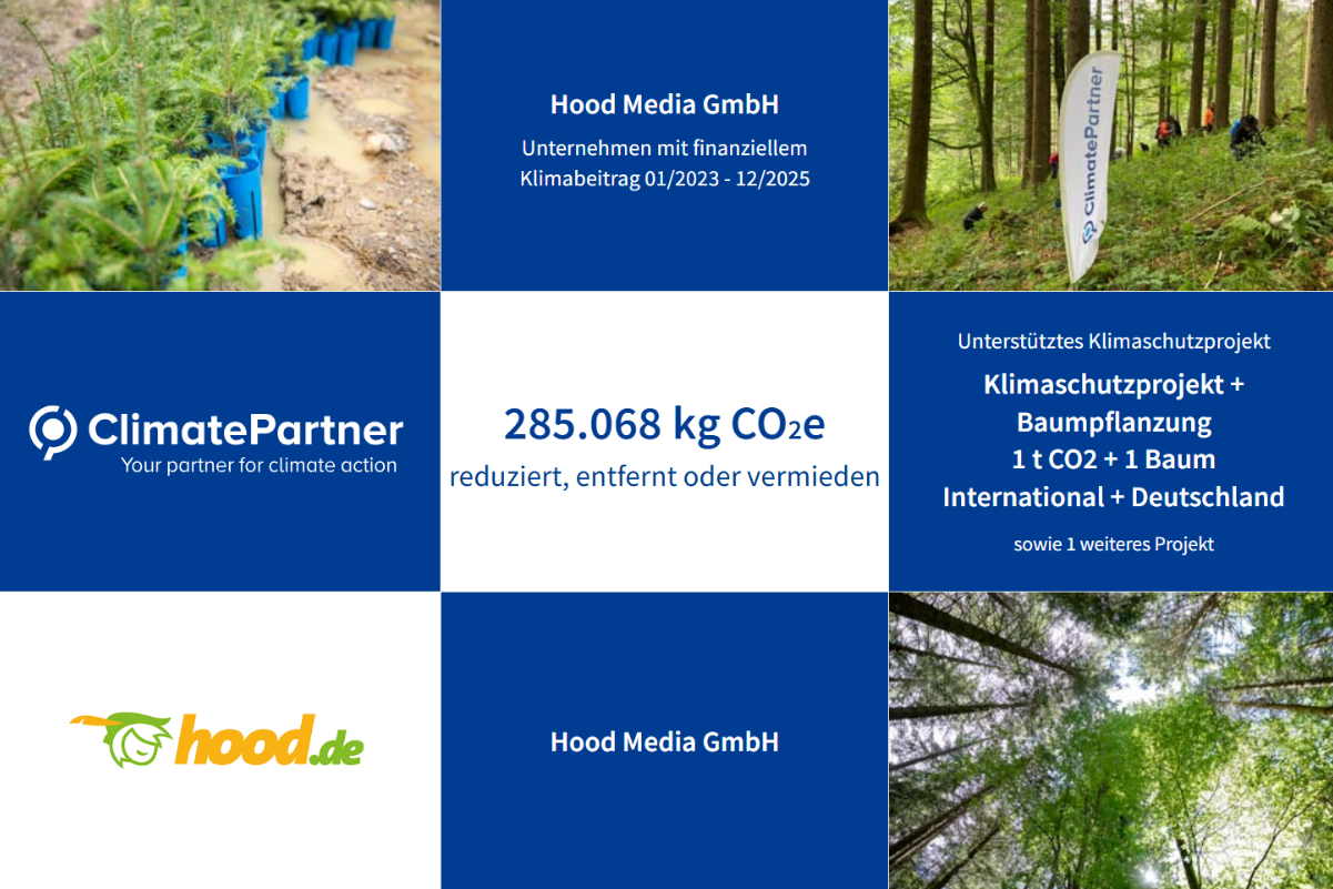 Was viele internationale Online-Plattformen noch unverbindlich und für die ferne Zukunft ankündigen – bei Hood.de ist es bereits Realität: Seit Anfang 2023 trägt der E-Commerce-Pionier aus Köln das offizielle ClimatePartner-Zertifikat – als einer der ersten großen Online-Marktplätze Deutschlands.